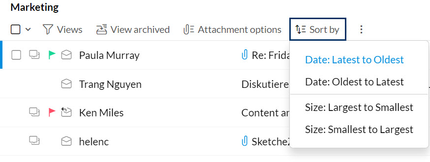 Zoho Mail lets you sort your emails according to your preference. You can sort your emails based on either the time they're received or the size of the emails by clicking the Sort by drop down.
