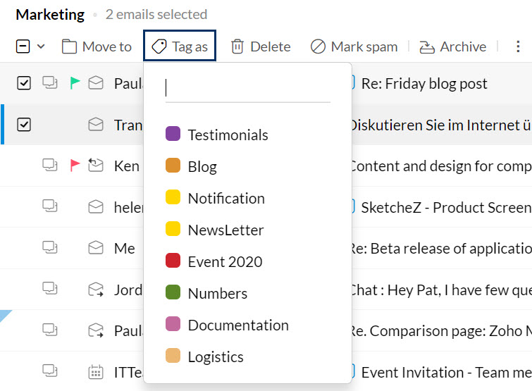 While viewing your emails from the email listing pane, you can select a few emails and add a particular tag to them. To add a tag to emails, select the checkbox next to the emails and click the Tag as icon from the top menu pane. Choose the relevant tags from the options listed.