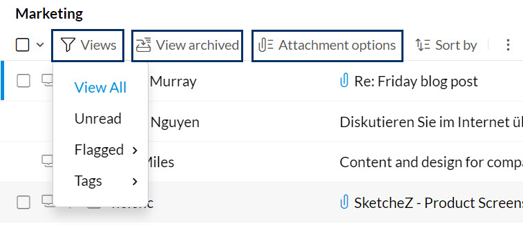 Zoho mail offers several views which make your email listing more organized and provides multiple options to locate the emails that you're searching for easily. You can view all the unread emails, emails that you've added a specific tag/flag to, emails that are archived and those that contain attachments from the Views, View archived and Attachment options icons in the menu pane.