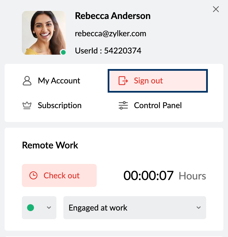 To Sign Out from all Zoho Apps, click on your Profile Image in the top right corner. You will see a drop-down with an option to Sign out. When you sign out, you will be signed out of all other Zoho Applications, in other tabs in the current browser.