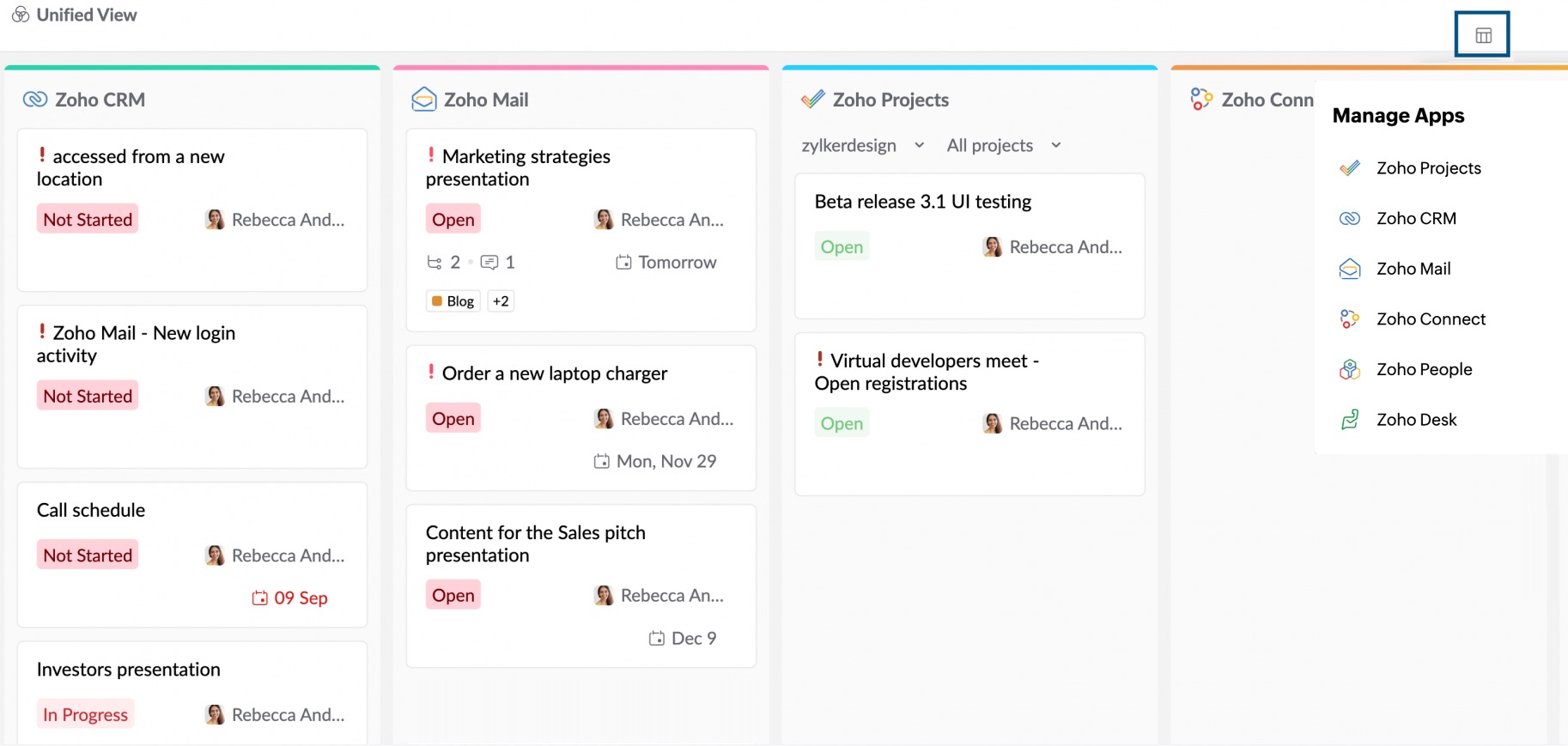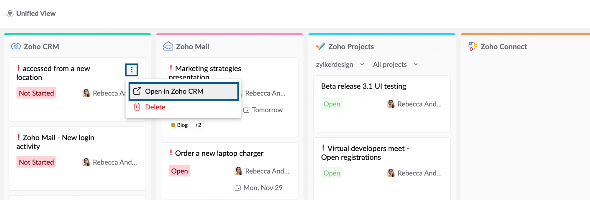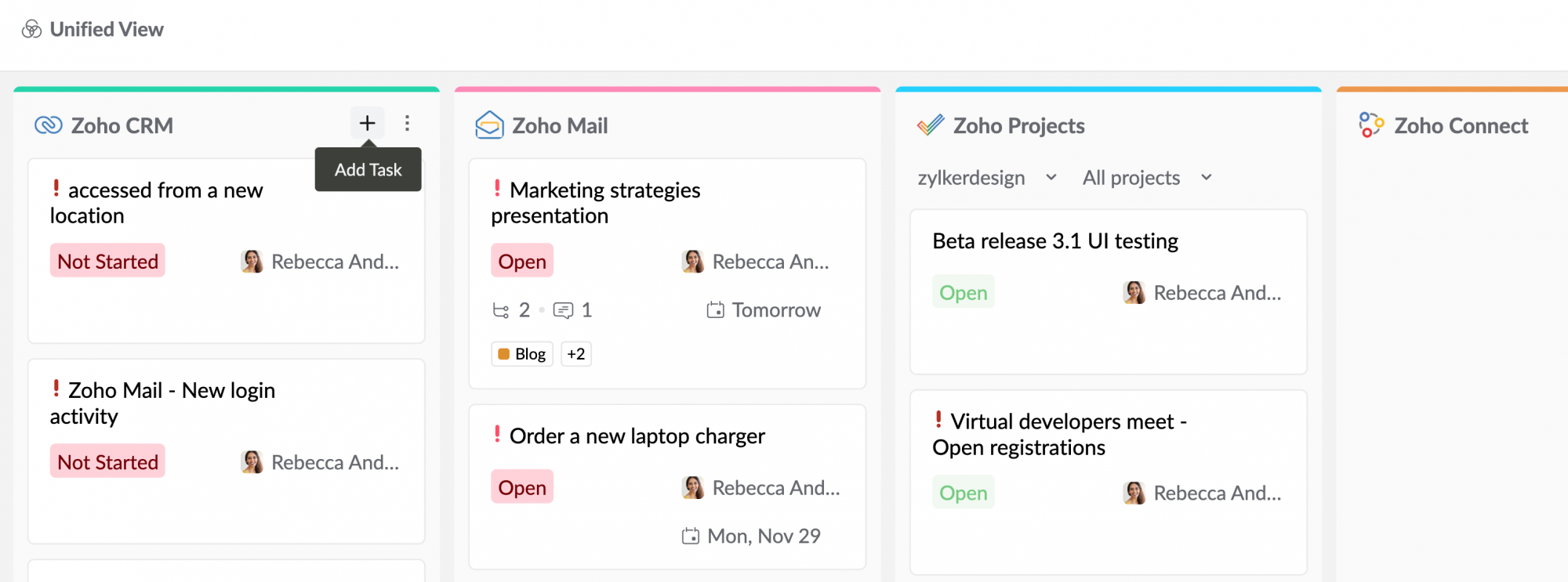 Unified View in Tasks powered by Zoho ToDo is a one-stop destination where you can access tasks from five different Zoho applications— Zoho ToDo, Zoho CRM, Zoho Projects, Zoho People, Zoho Desk and Zoho Connect, on a single screen. To access Unified View,
