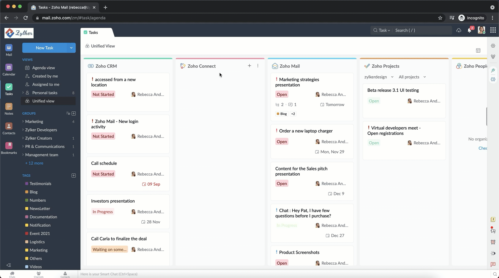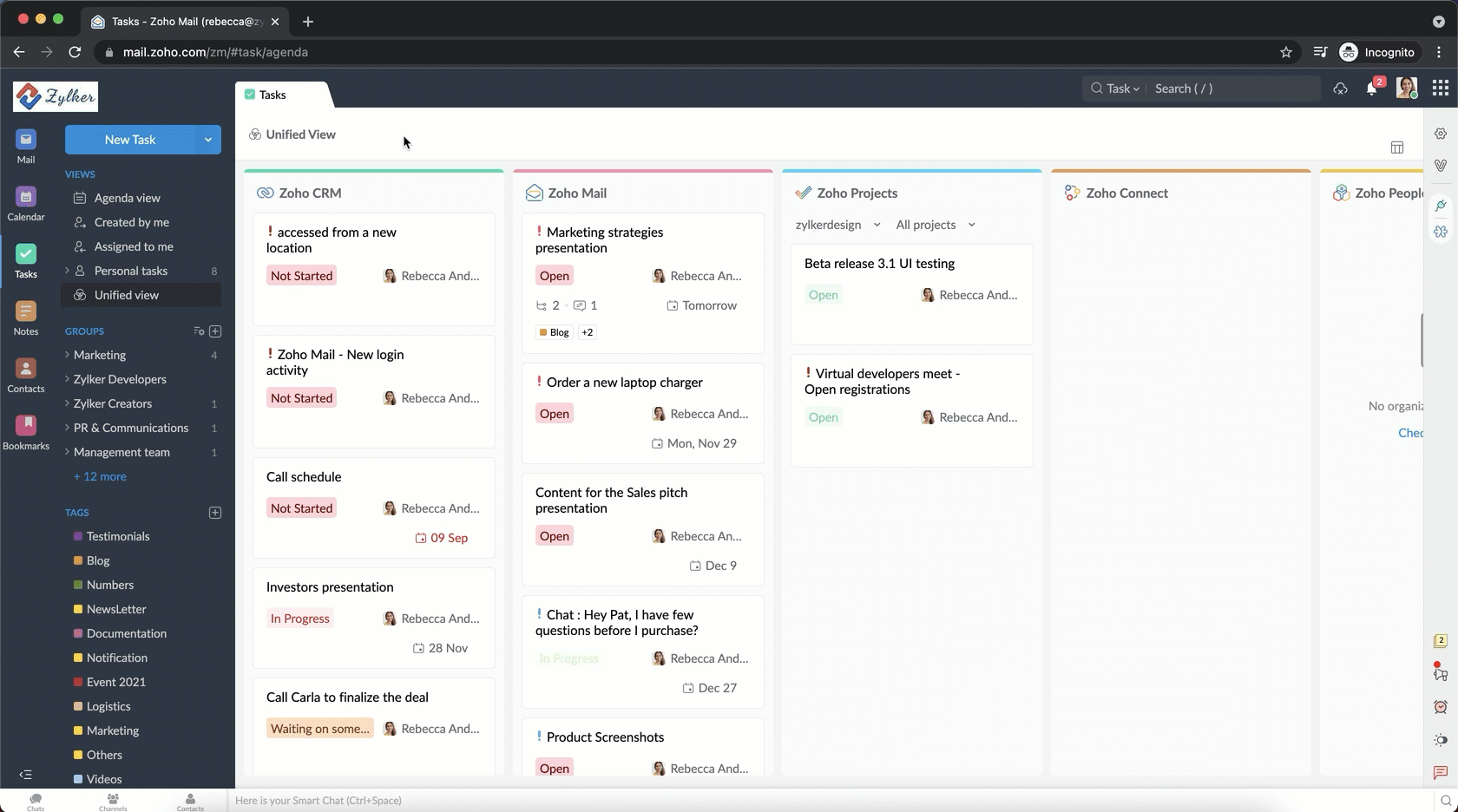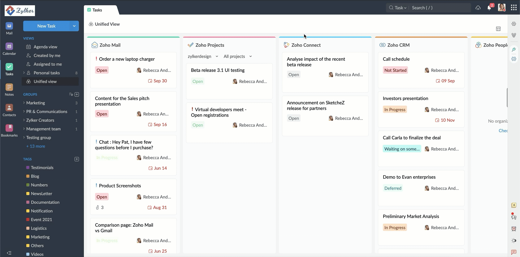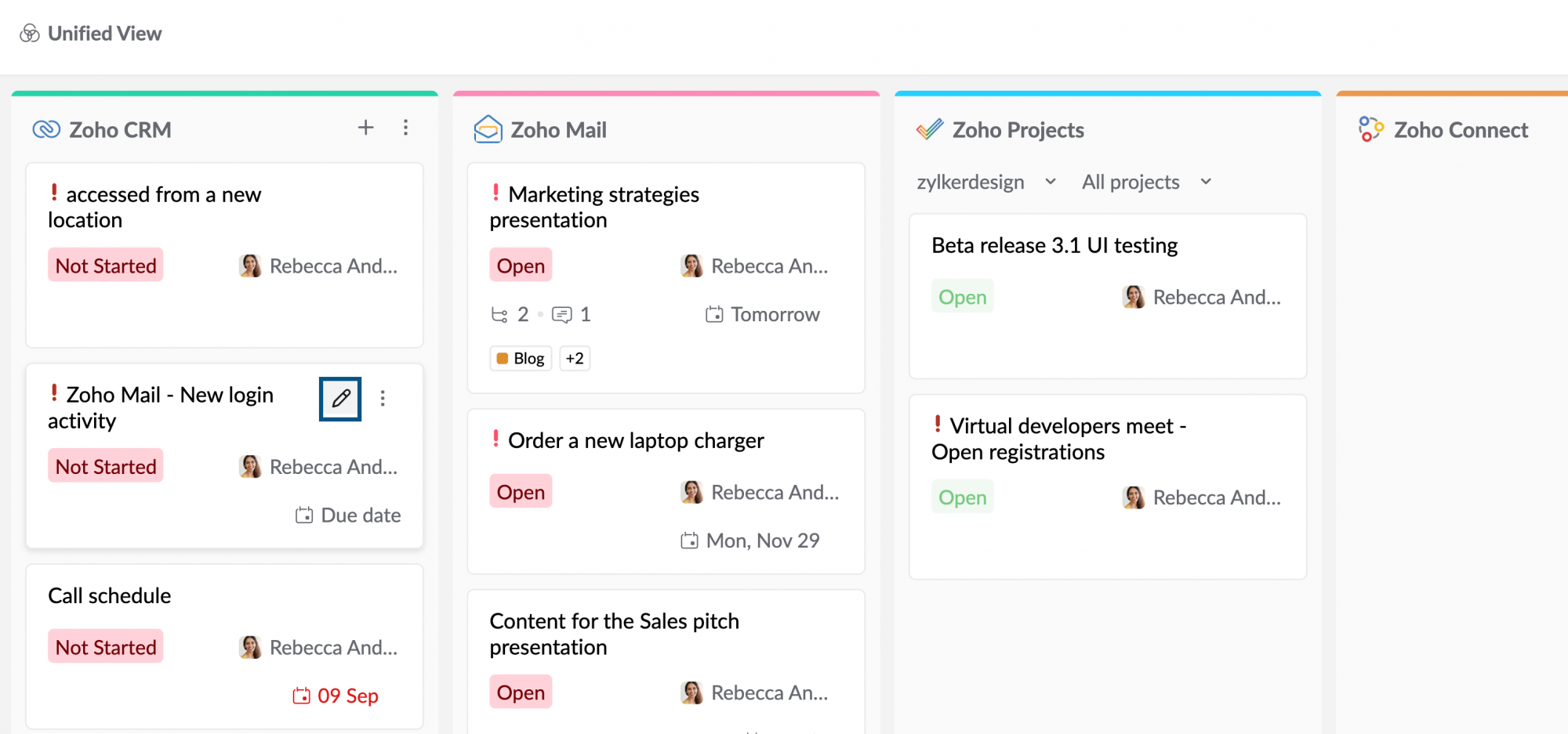 Unified View in Tasks powered by Zoho ToDo is a one-stop destination where you can access tasks from five different Zoho applications— Zoho ToDo, Zoho CRM, Zoho Projects, Zoho People, Zoho Desk and Zoho Connect, on a single screen. To access Unified View,