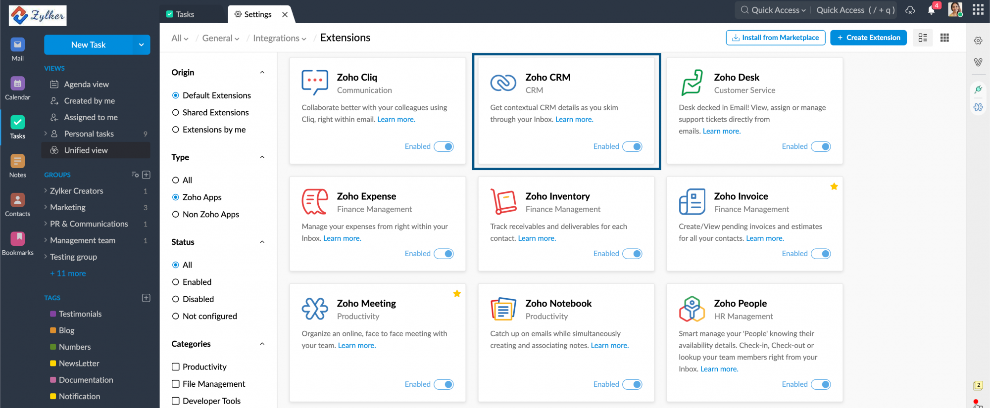 To access tasks from applications other than Zoho Mail, the integration should be enabled between that application and Tasks. To do so,