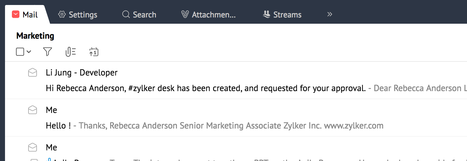 Zoho Mail supports multiple tabs view. By default, the current application is listed in the First or Default tab. The Search results, Settings, Attachment Viewer, Composer all open in new tabs, to effectively manage multi-tasking inside Webmail, without losing the context.