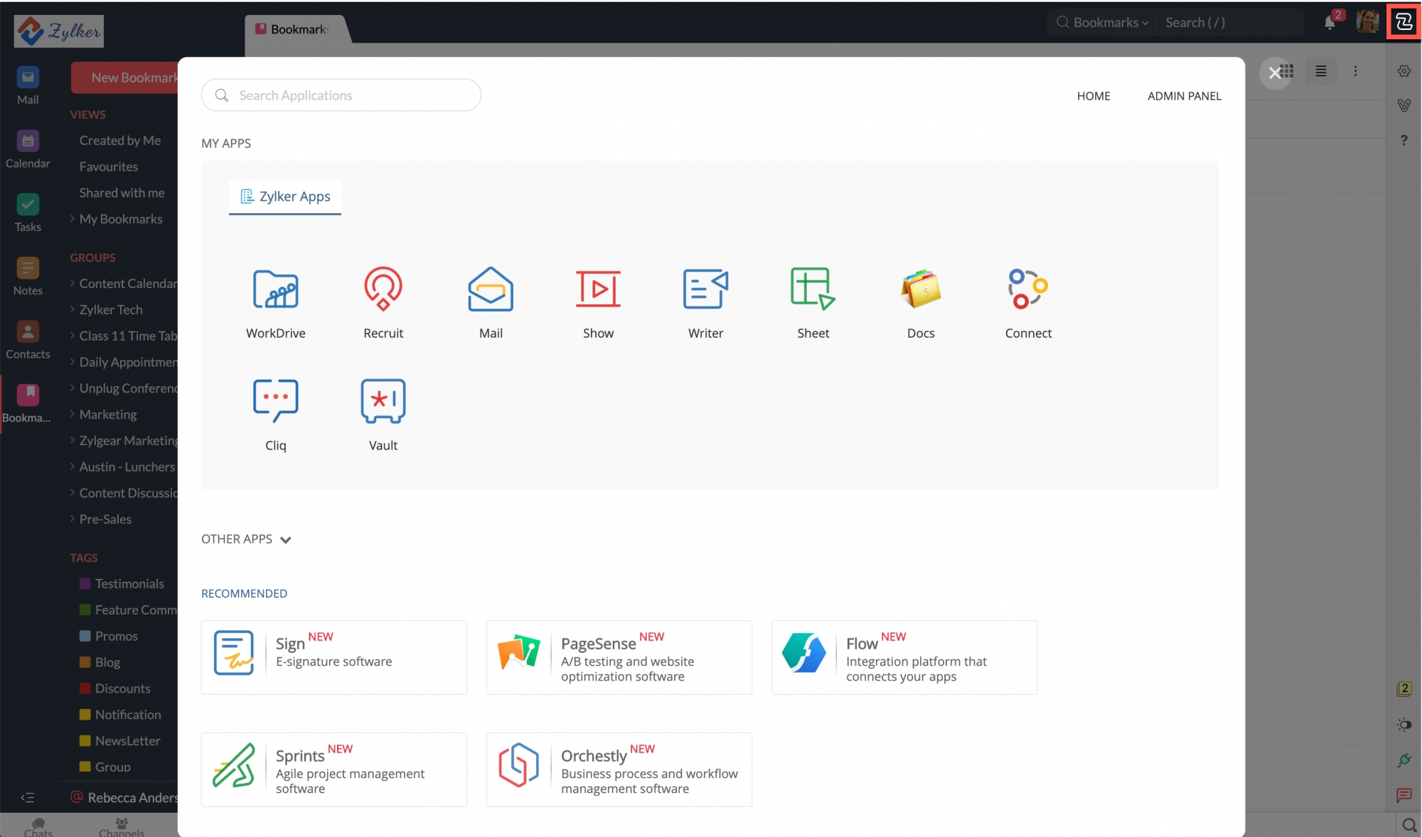 In the upper part of the screen, you can click the Zoho Apps icon in the top right corner, near your profile to view and access the other Zoho applications.
