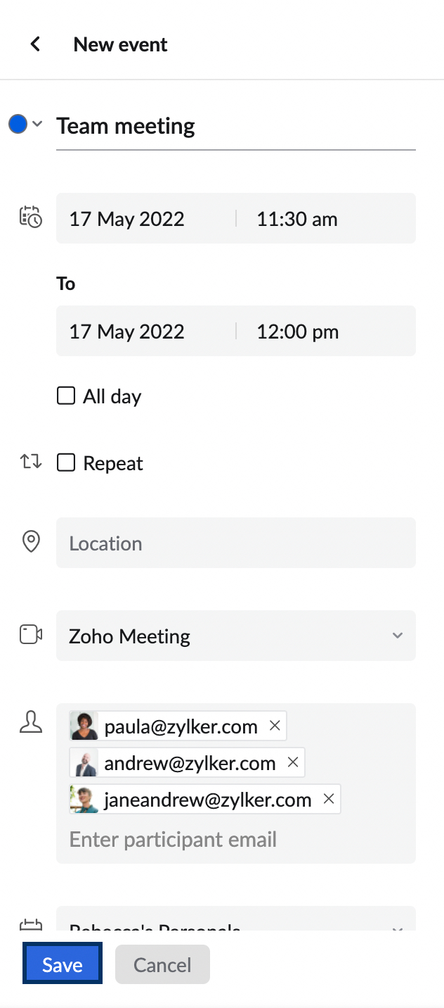 - Once satisfied with the entered event details, click Save to finalize and add the event to your calendar.