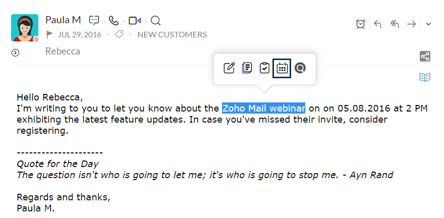 You can create an event using the contextual integration menu available in Zoho Mail. To create an event using the text in email content, click and select the text you want to add as the event title. Select the Calendar icon from the contextual menu pop-up. Provide other details to create an event and click Save.
