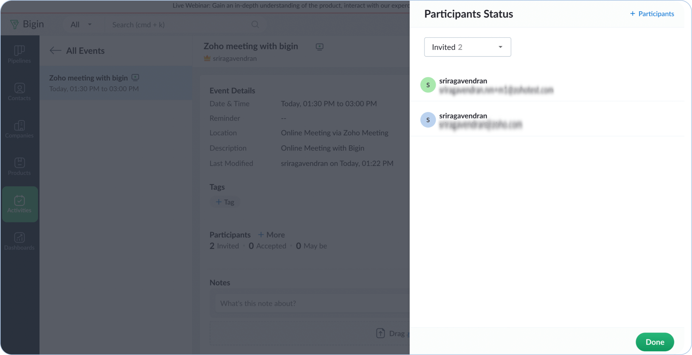 Conduct immersive online meetings with your clients, partners, or customers. To invite participants, go to the Activities module and click the Events tab. Now, select an online event and click +More in the participants’ section to select contacts, users, or email addresses. You can also click the Copy invitation link to get the meeting invitation URL and share it via email or social media.