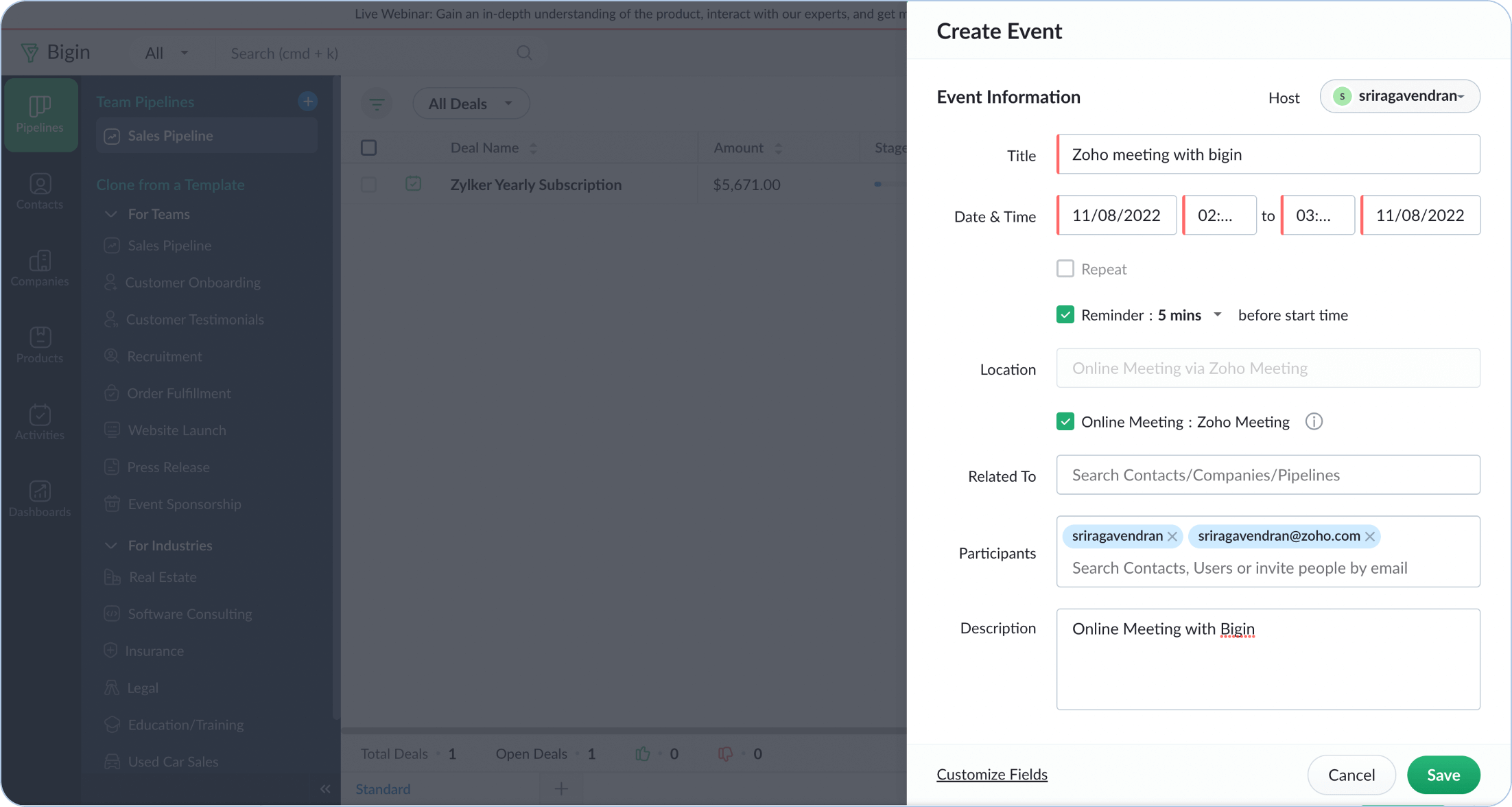 Online meetings save a lot of time and are extremely simple to set up. You can meet online with your prospects and leads to give a product demonstration or hold any discussion where people from other locations can easily join. Once the integration is set up, you can create an online meeting from the Events module. When scheduling an event, there will be an “online meeting” option that you can enable to set up a virtual event.
