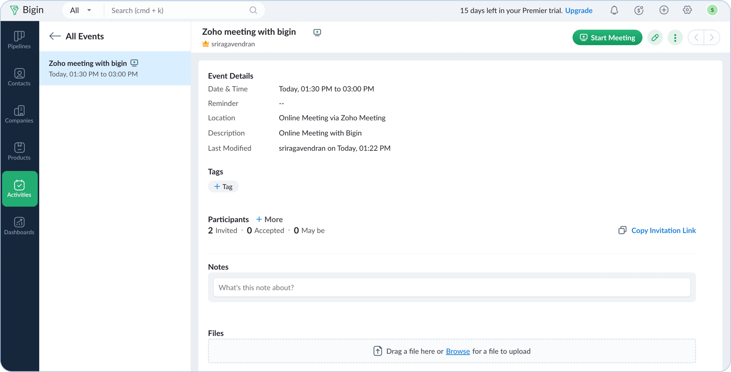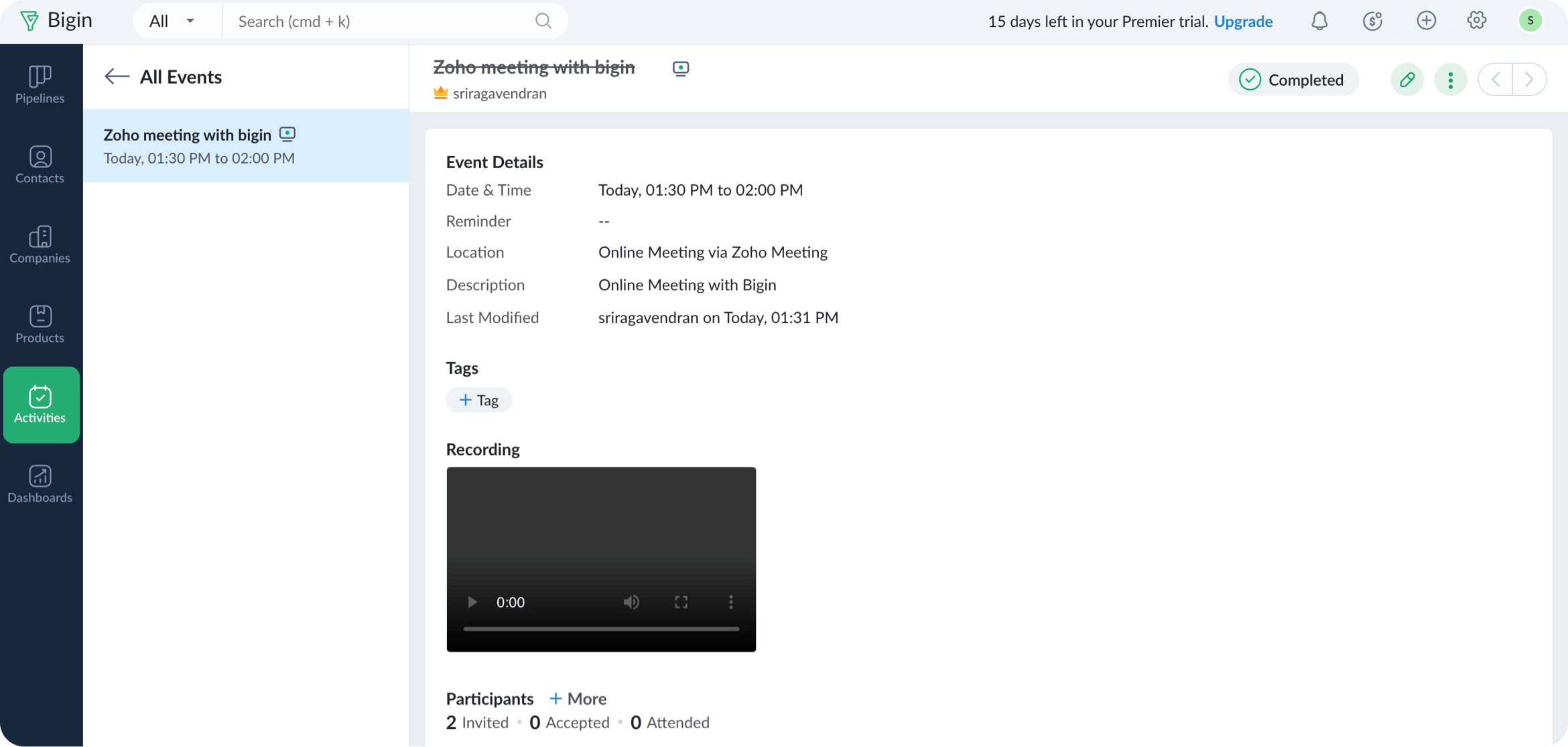 Zoho Meeting lets you record an online meeting, and it will be available on the Events details page in Bigin once the meeting is completed. You can also view the duration that each participant spent in the meeting. To view the recordings, open an online event and the video recording will be available under the Recording section.