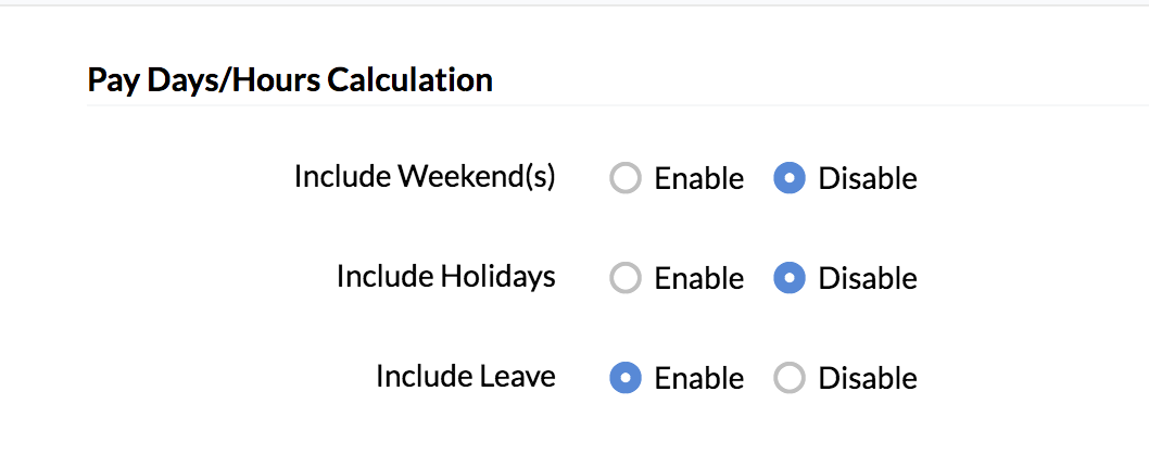 This Settings helps you define whether you would like to include Weekends/Holidays and Leave while calculating the Days/Hours for Pay calculation.