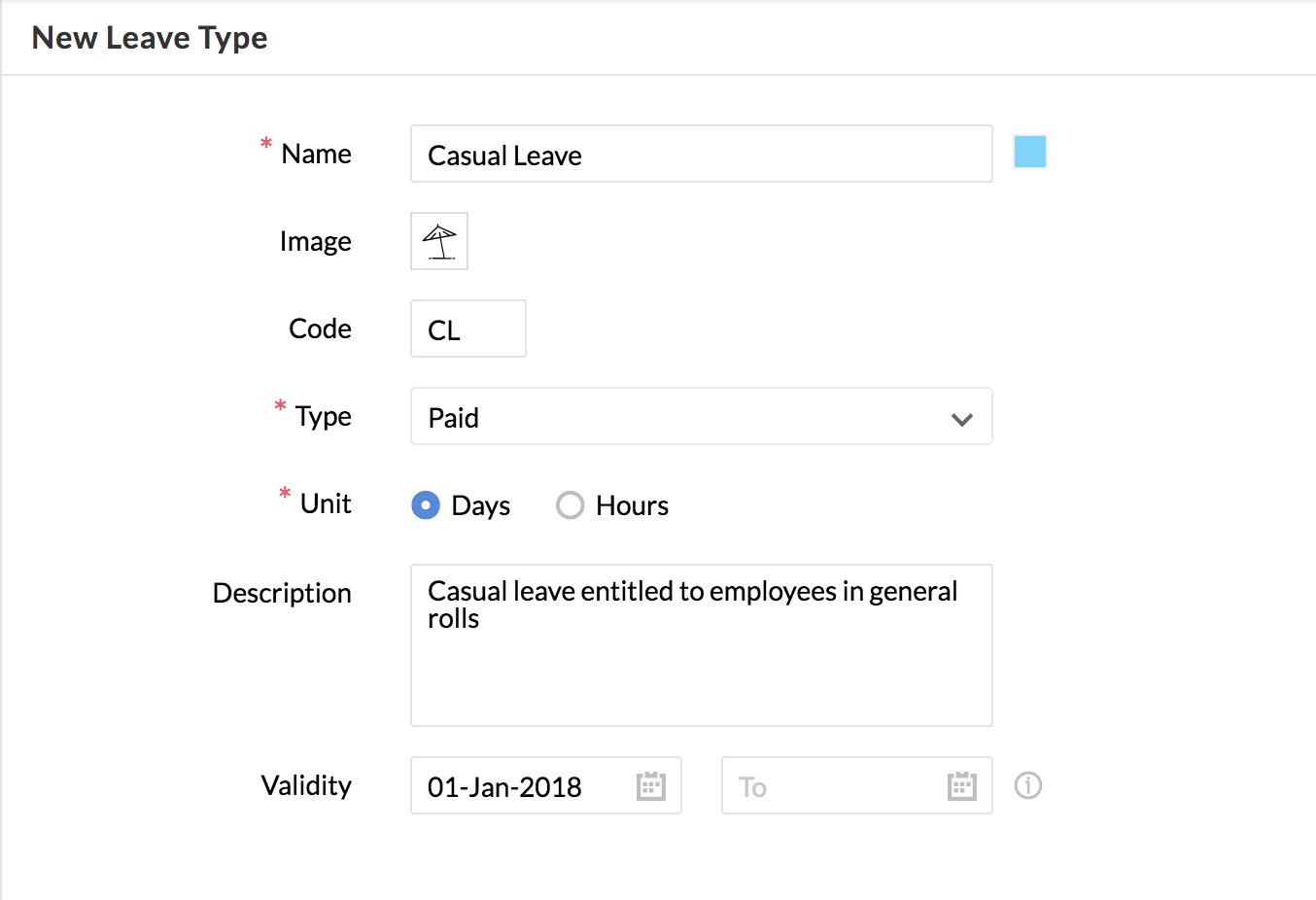 - Give a Name, image and Code - Code is a unique reference for the leave type. For eg, the code for Casual Leave can be given for CL for easy identification