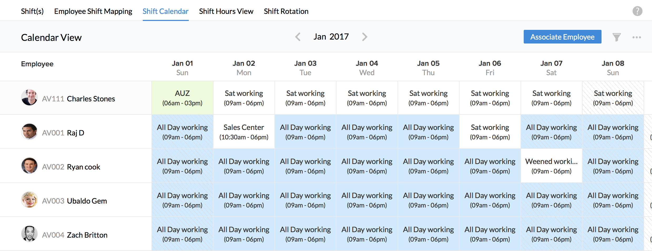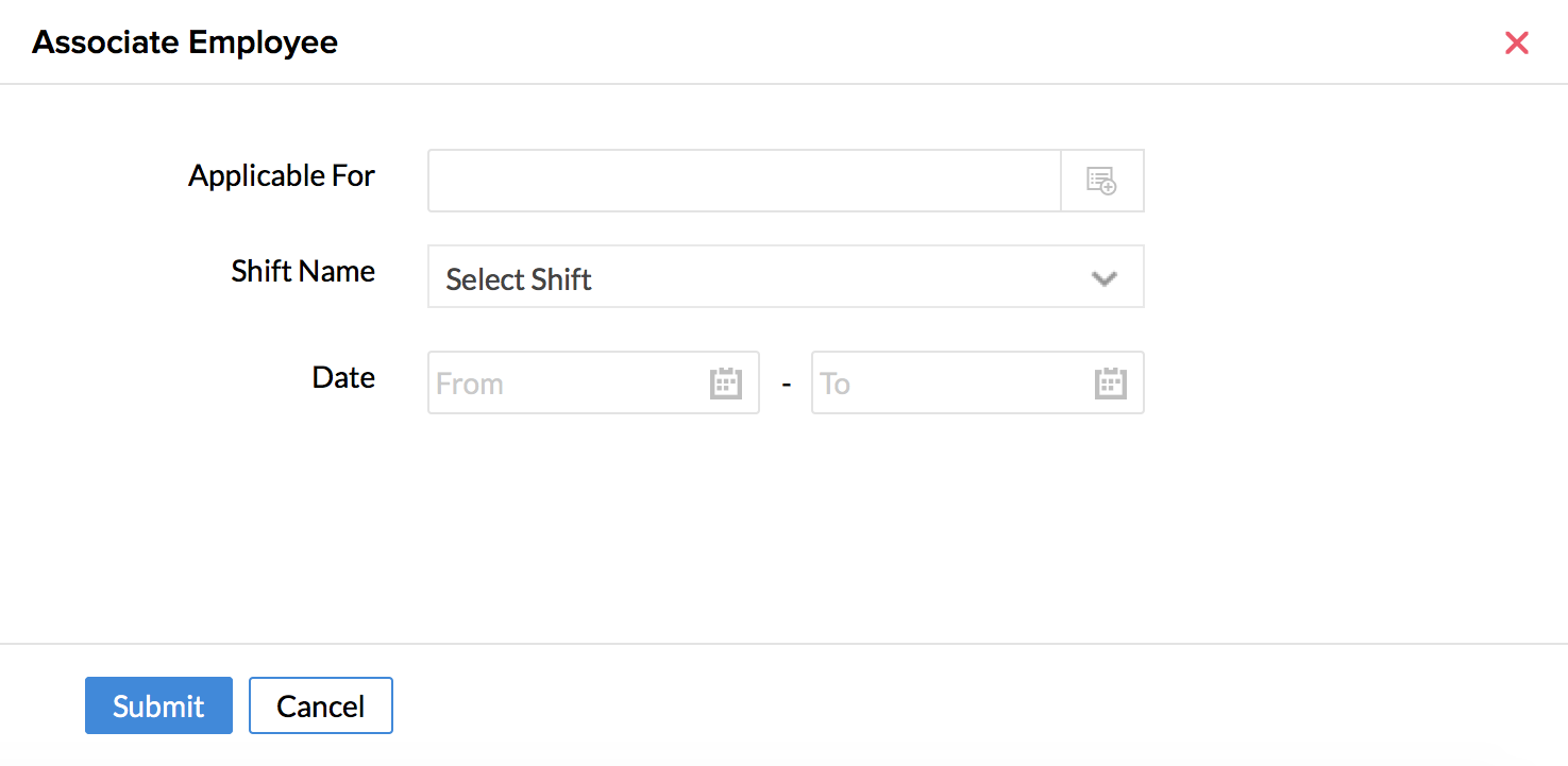 You'll find the button “Associate Employee”. Once this button is clicked it will lead you to the same steps as mentioned under 'User shifts'.