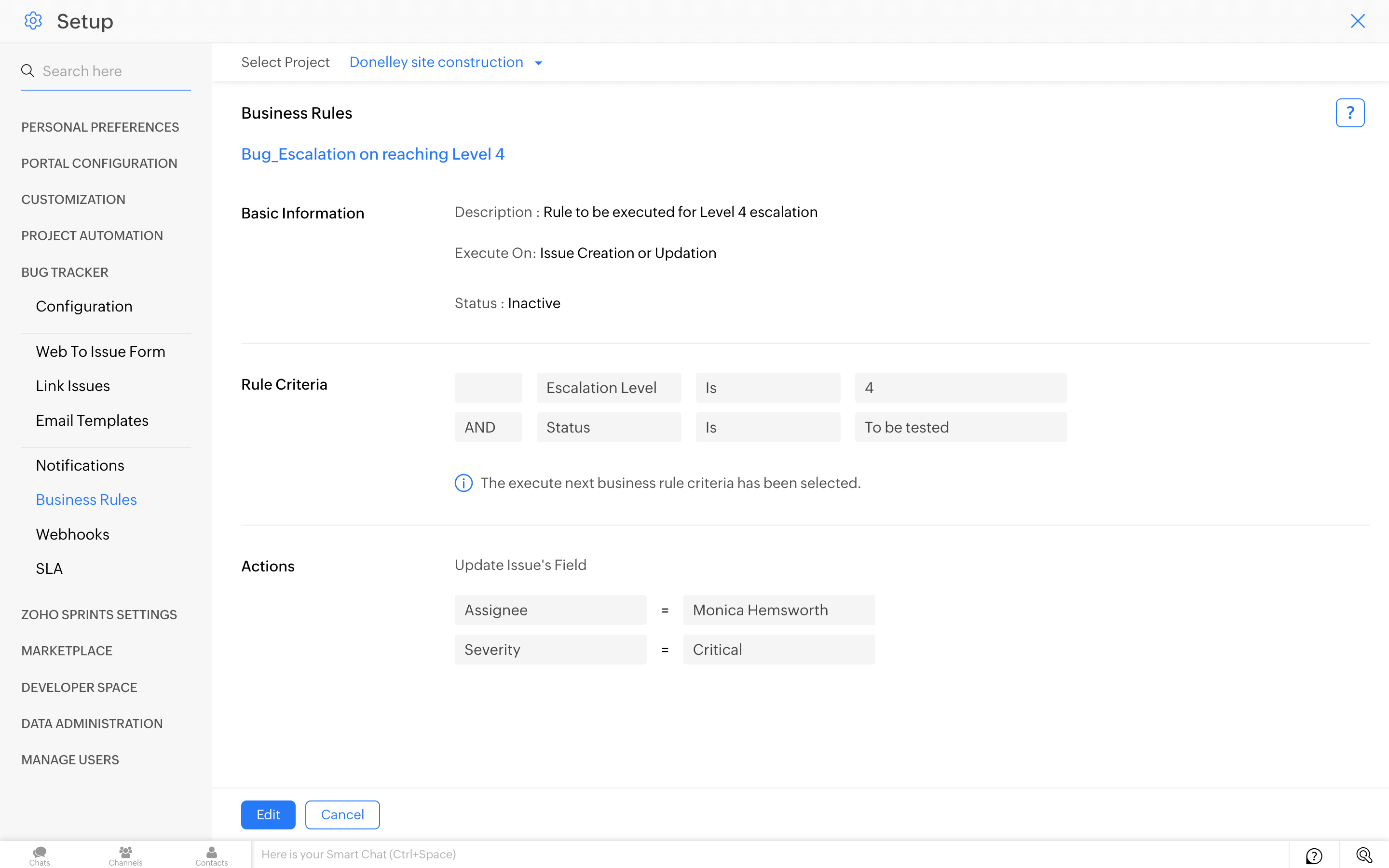 As configurações do BugTracker contêm opções que permitem aos administradores acionar atualizações e notificações por e-mail, além de chamar aplicativos de terceiros quando regras predefinidas forem atendidas. Além disso, automatize os SLAs para cumprir os termos do contrato.