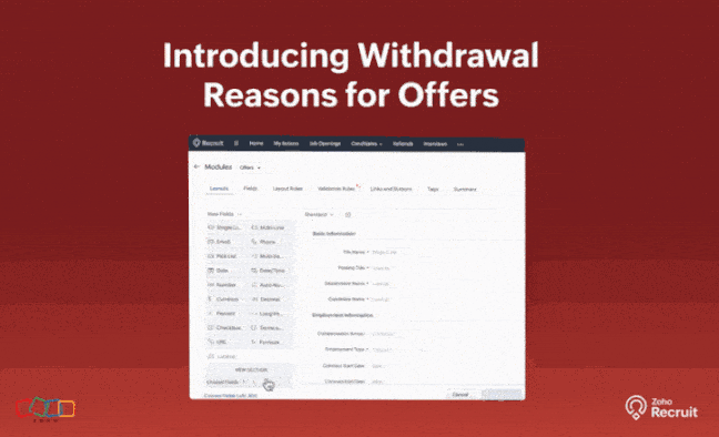 EnhancementsGet your digital candidate acceptance with ZohoSign/DocuSign/AdobeSign. With just a few clicks, you can start sending offer letters with your e-signature. This is a quick, easy, and completely paperless process to get your offer letter signed. Learn More.