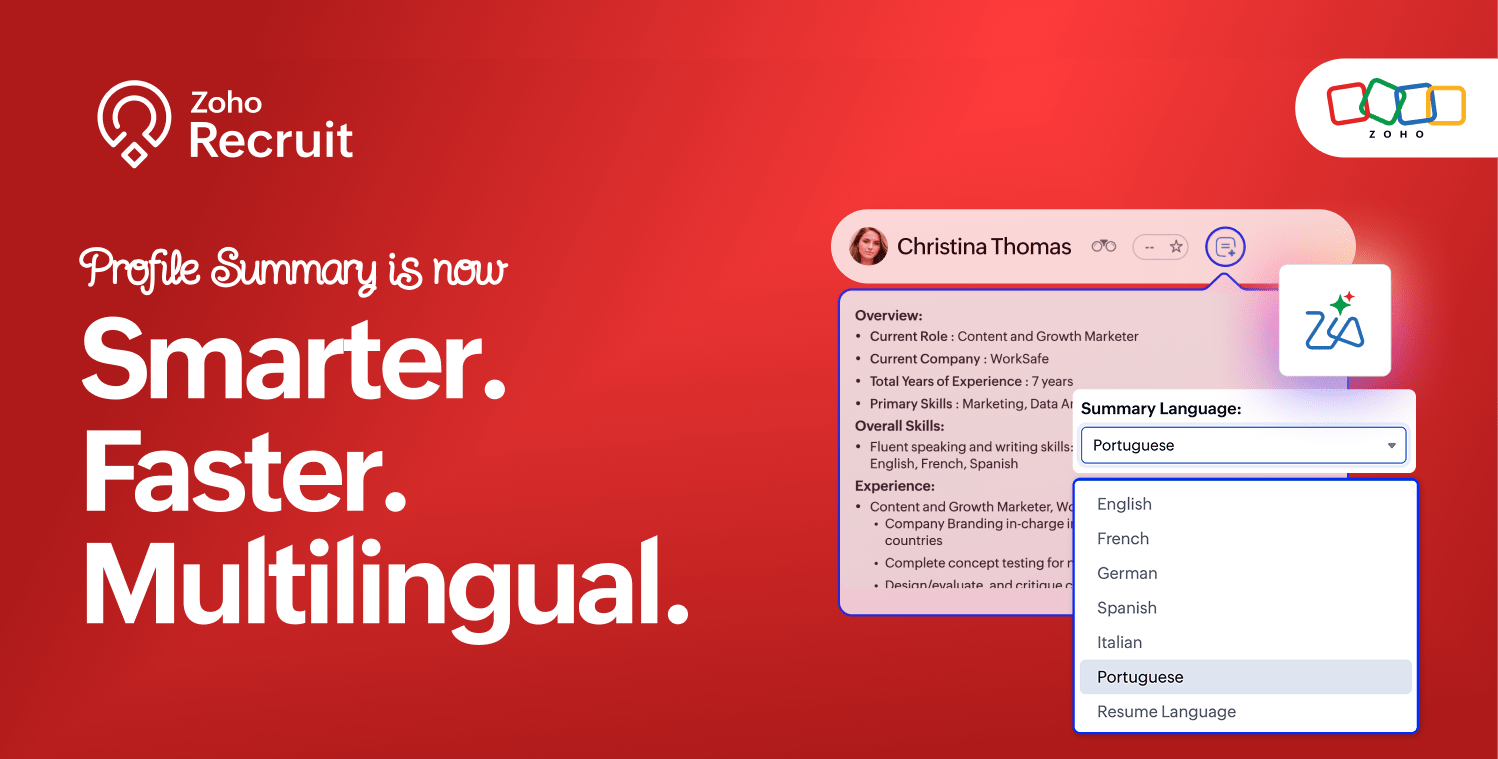 EnhancementsZia Profile Summary now supports six languages and delivers faster summaries. Translate summaries instantly across supported languages for smoother global hiring.
