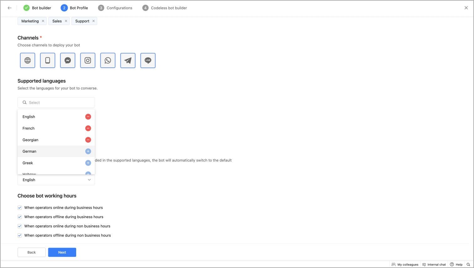 - Then, Set Working Hours for your bots. The bot's working hours can be chosen based on your business hours and the operator's availability.