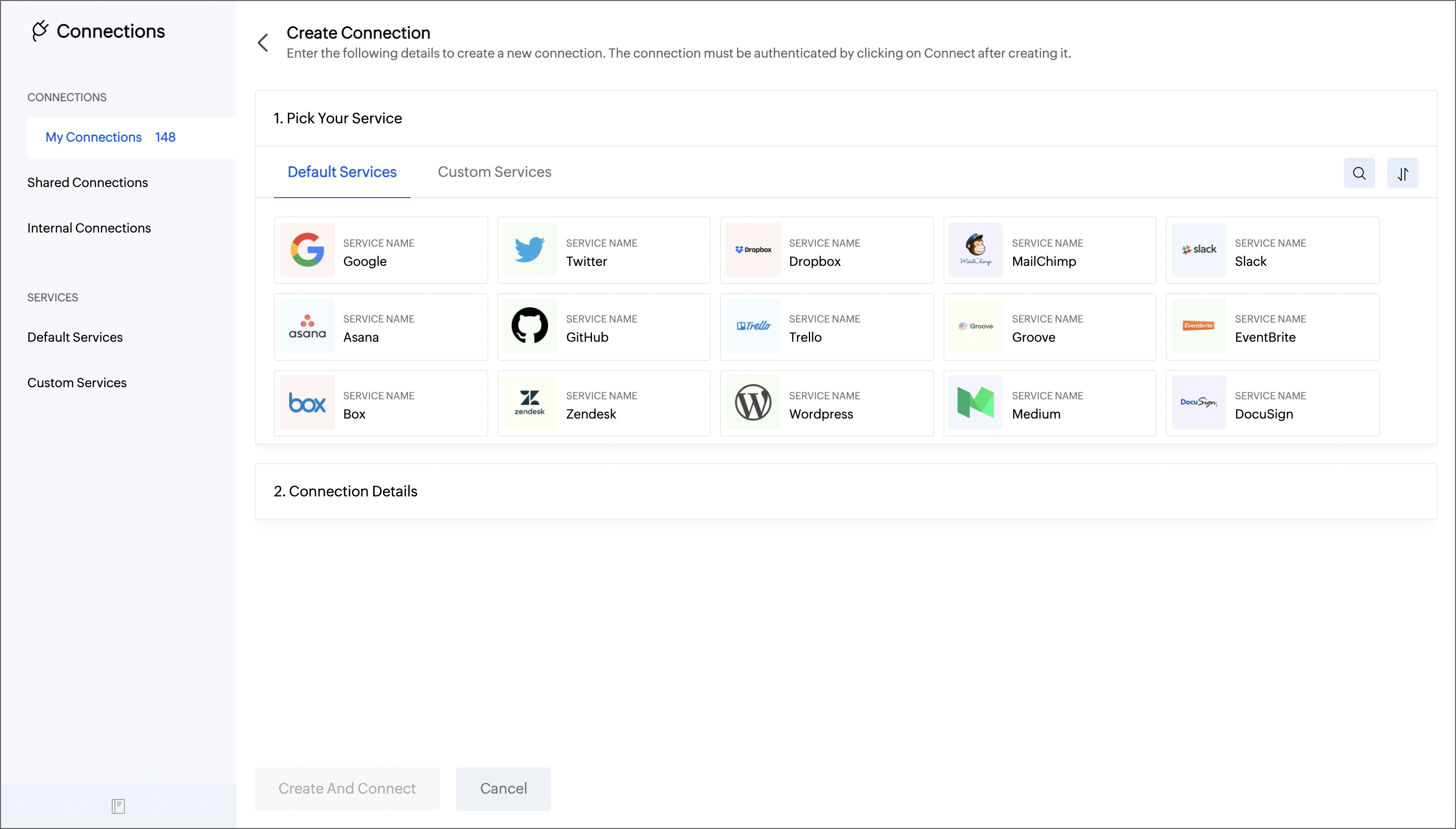 - You can select the Custom Service option to create a connection if the service you are looking for is not available in the pre-registered services list.