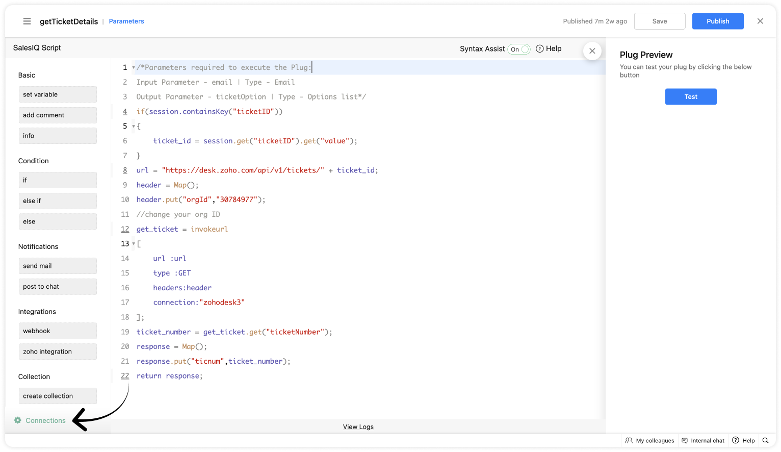The invoke URL task is used to access the third-party services from Zoho SalesIQ via Connections. To implement a connection that is created, you can use the Invoke URL deluge code that is displayed upon creating the connection. The task and its parameters are explained on the Invoke URL page.