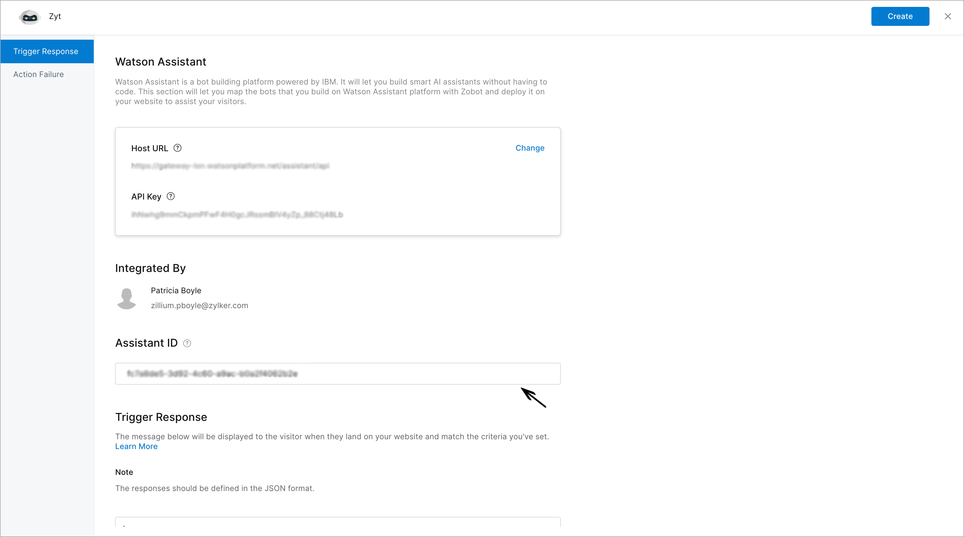 - Navigate to Zoho SalesIQ > Settings > Zobot > Choose your watson bot, and in the zobot configuration page, provide the Host URL and API key and configure. Then, paste the Assistant ID and click create. Your Watson Assistant is integrated with Zobot and ready to assist your website visitors