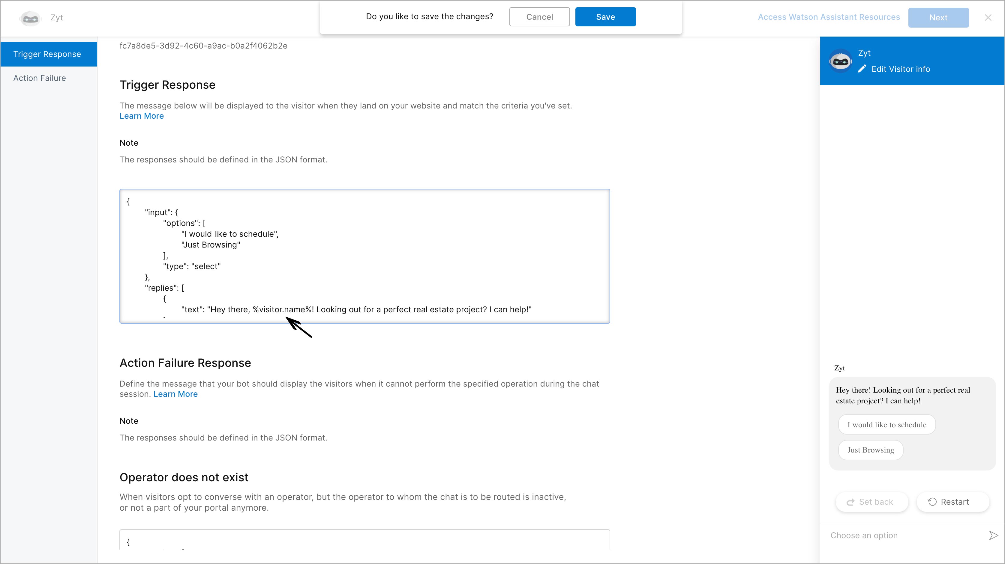 Visitor info will be passed on to Watson for framing an assistant reply based on the visitor information like visitor name, visitor region, etc. While processing the node response inside the dialog, the values will be available inside the context variables. Here, two variables will be received: