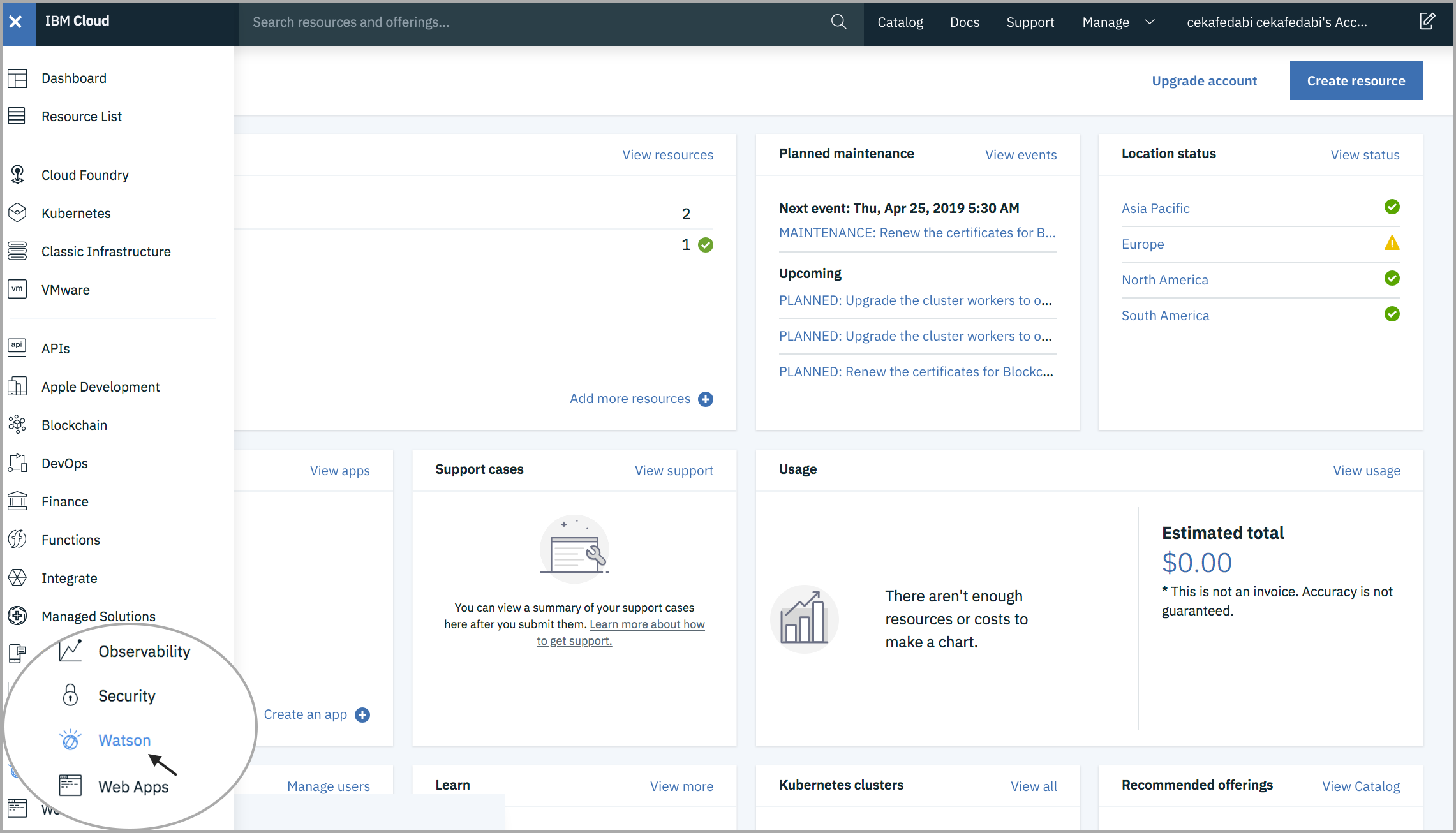 - Login to IBM Cloud. In the left menu, choose Watson.