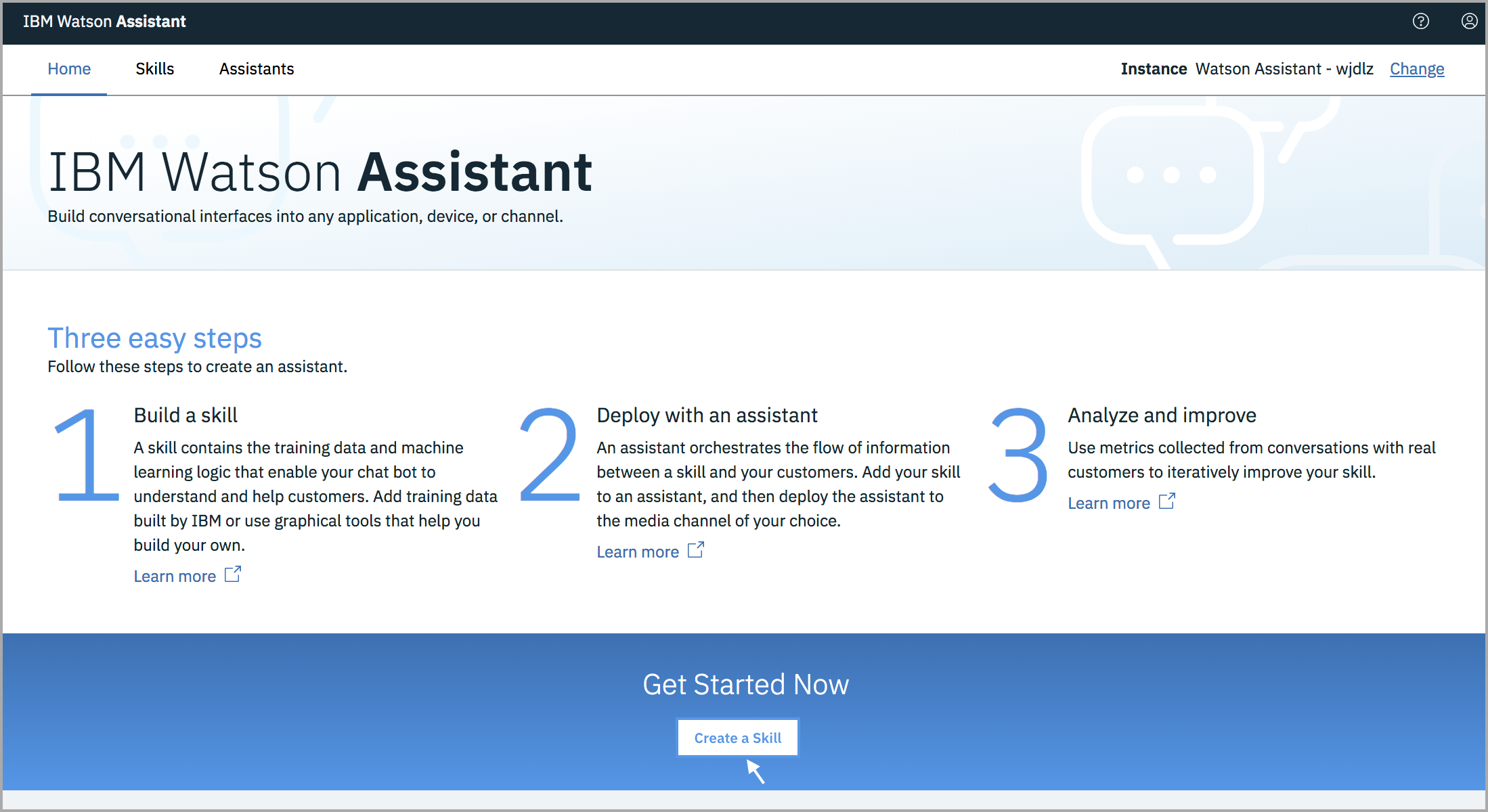 - From the home page of the Watson Assistant tool, click Create a Skill.
