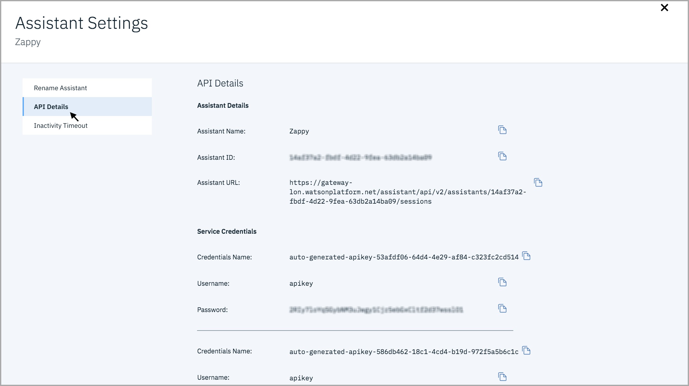 - The Watson Assistant Settings page appear, click API Details and copy the Assistant ID from the page.