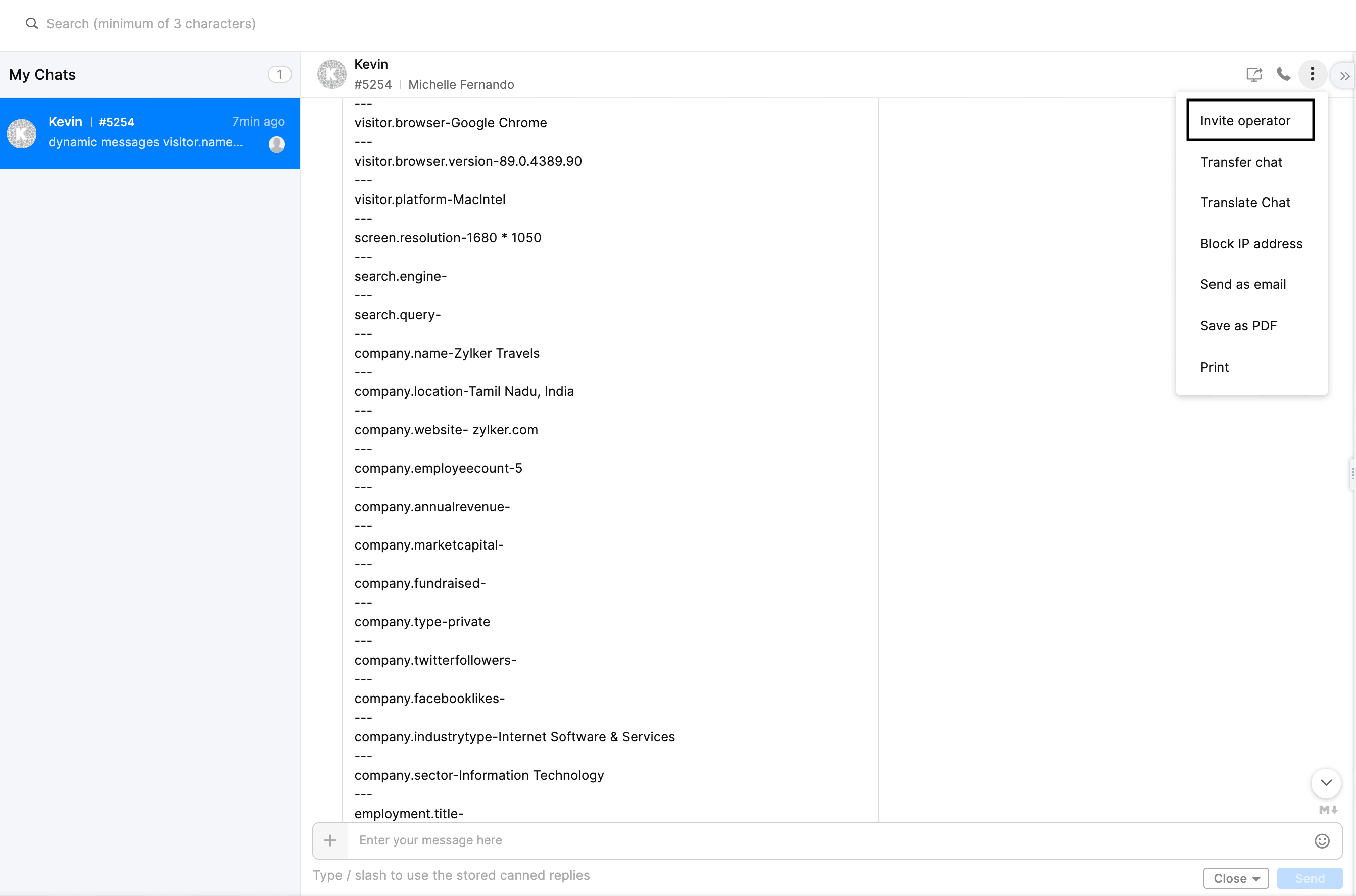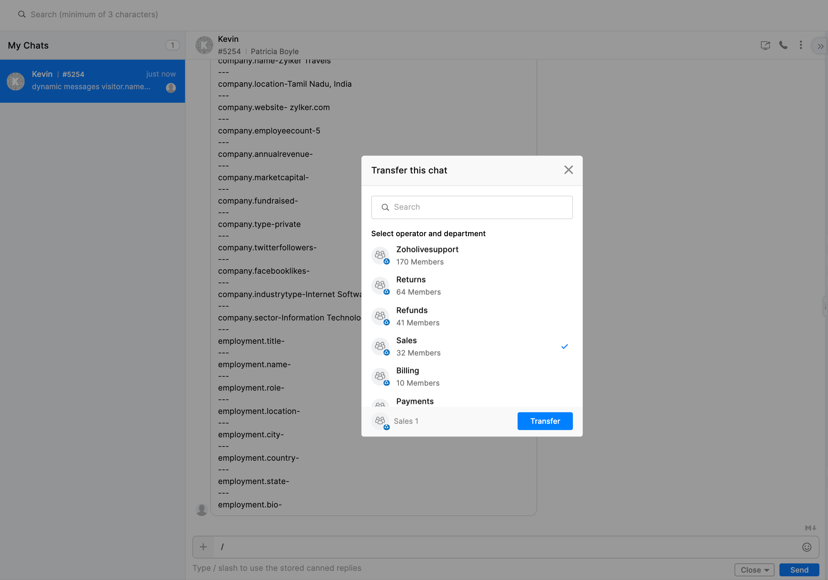 If you wish to transfer the on-going chat to another operator. You can tap on the More action button on the chat window and click the Transfer chat option.