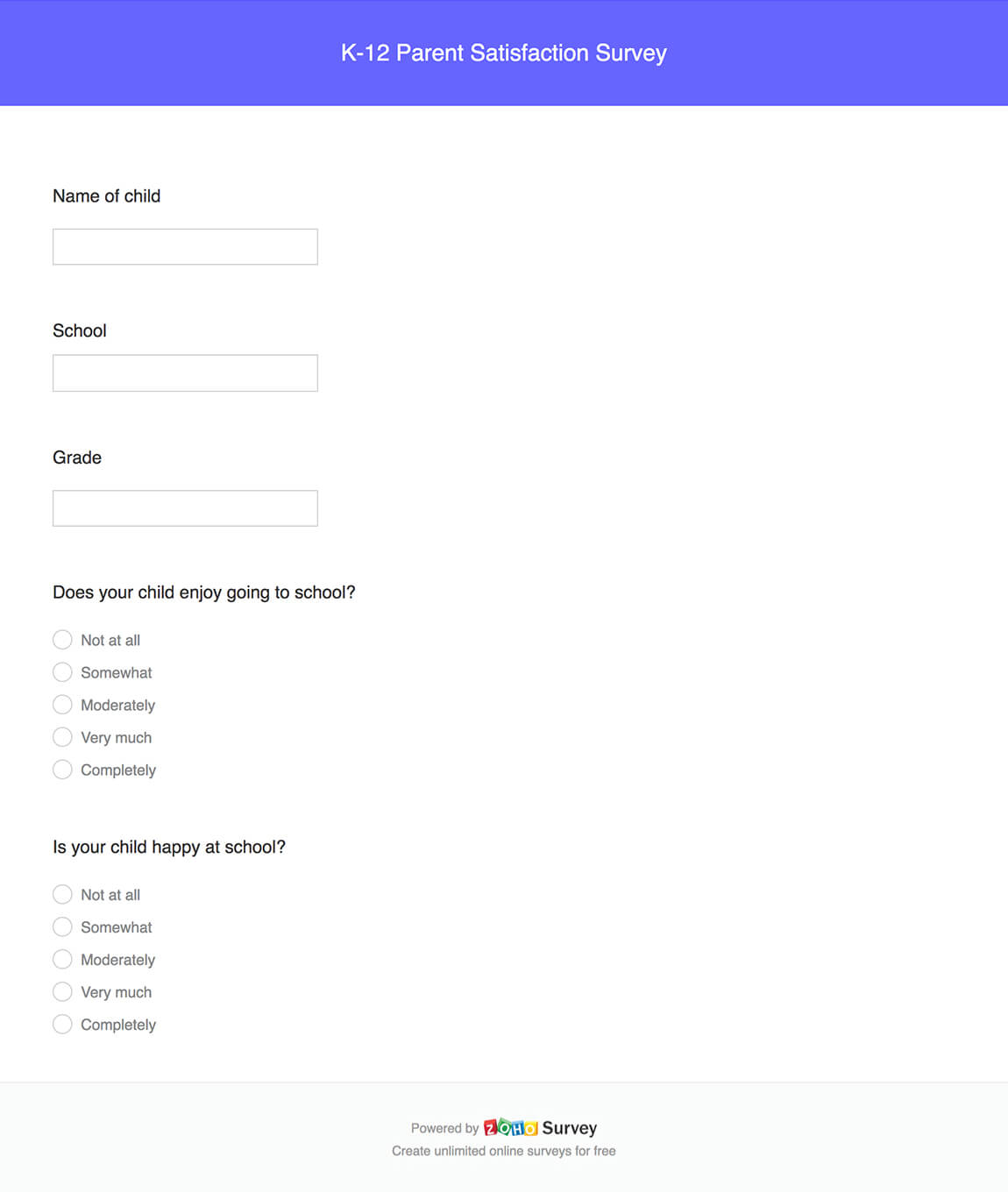 Zoho Survey can help you with its many response collection tools. Send your survey as an email, post it on your website, collect it offline, or do all of the above. The primary goal is to reach most parents. Remember that parents are very busy and should be reached when and where they feel most comfortable.