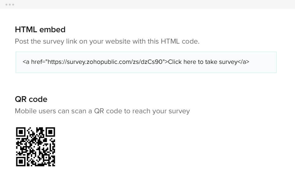 You can embed the created surveys on your website using HTML code and QR codes. You can also embed your survey questions directly into email campaigns and mass mailers. Feel free to give a shout out on your social media channels too.