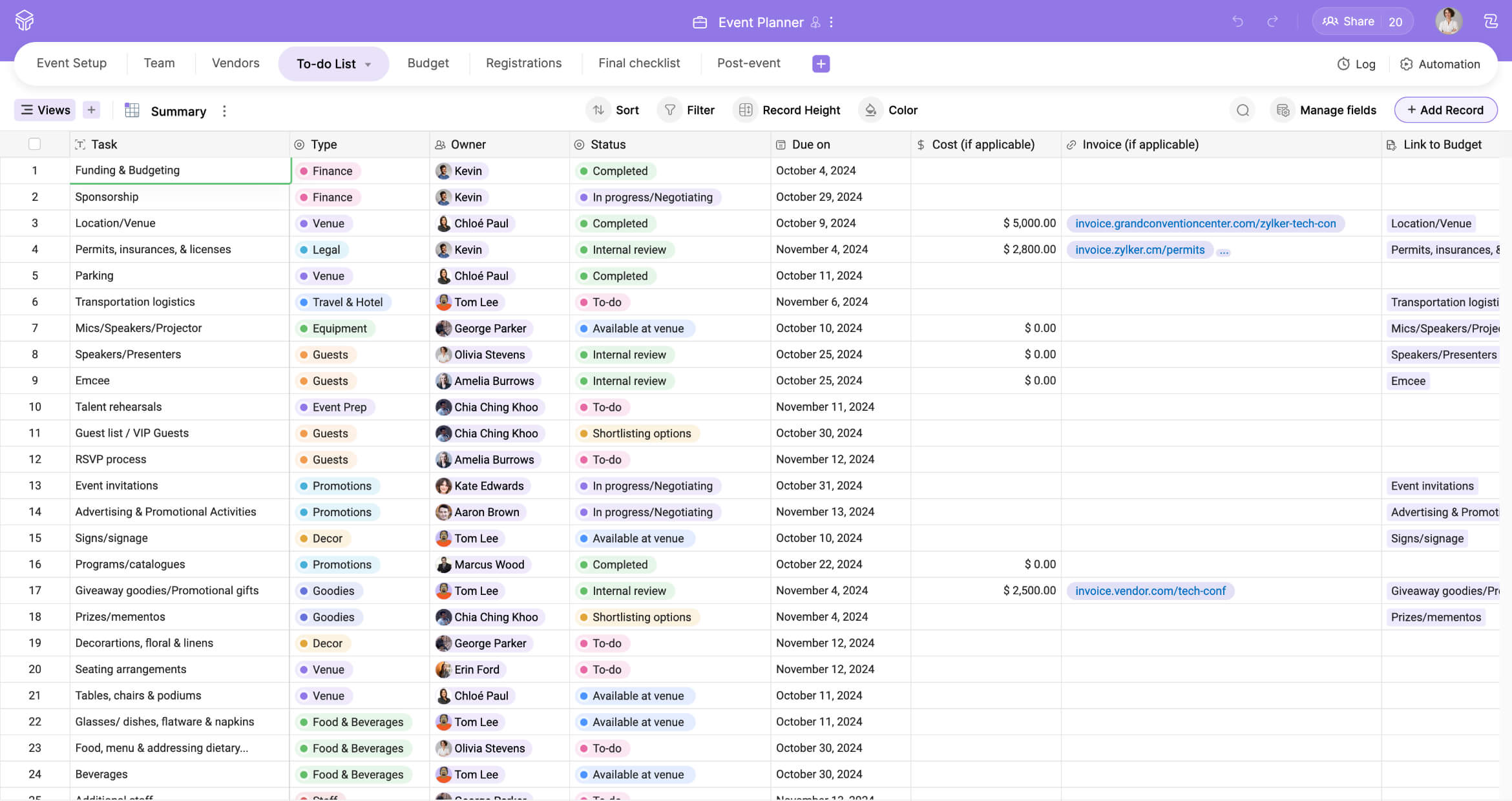 Whether you’re a professional or new to event planning, the event planner template by Zoho Tables will give you a head start.