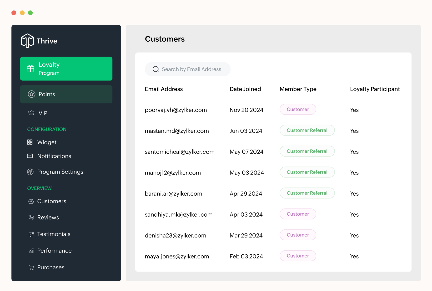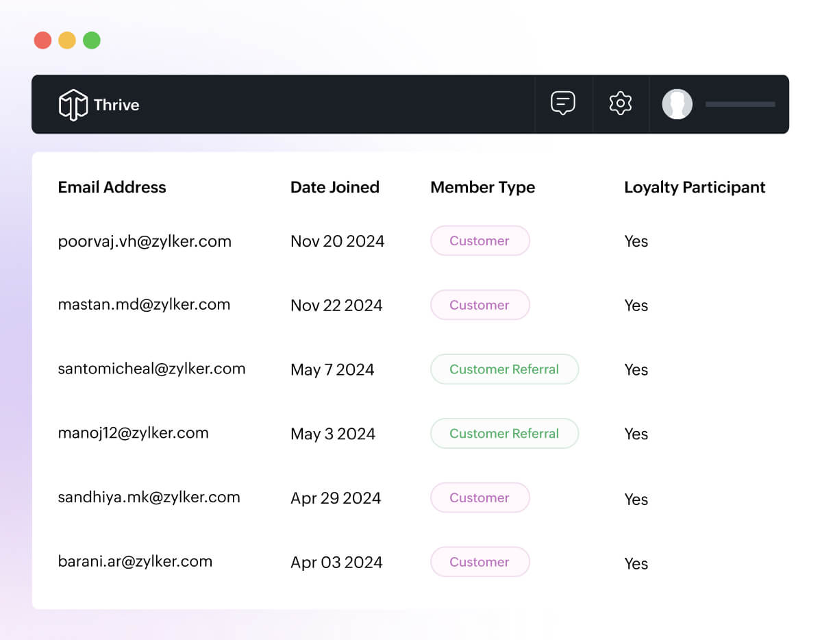 With Zoho Thrive's Customers Overview, you can seamlessly track all important customer information, from their email addresses and member types to their loyalty participation status. Stay on top of key customer data, all in one place.