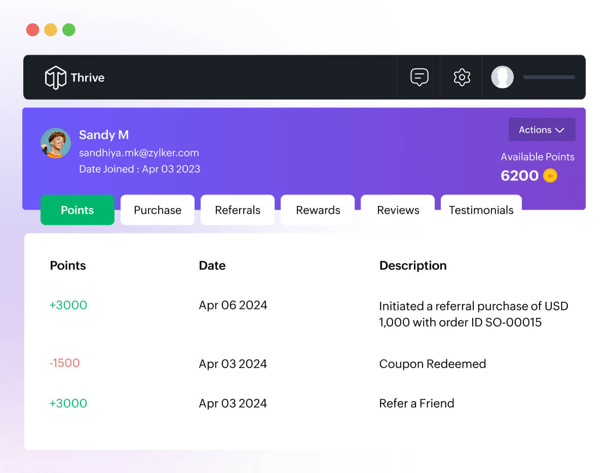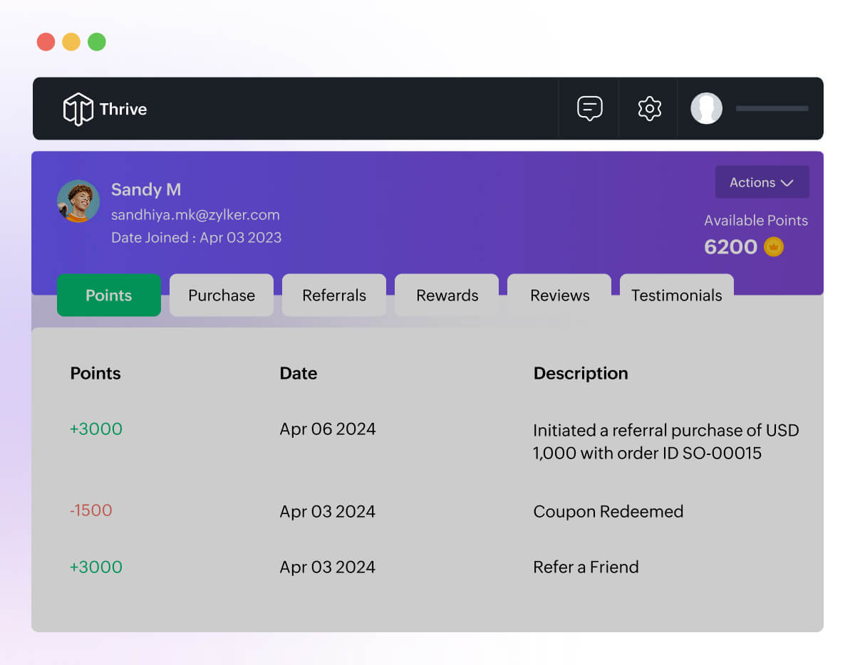 Yes, Zoho Thrive lets you dive into each customer's journey—including points activity, referrals, reviews, and rewards, to understand their engagement better.