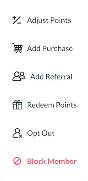 From the customer details page, you can adjust loyalty points, add purchases or referrals, help with points redemptions, and manage membership status, all in one place.