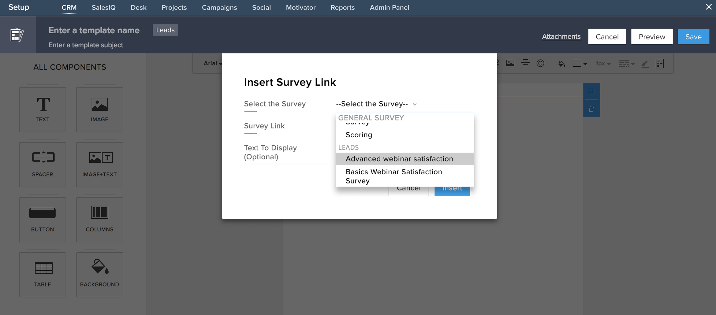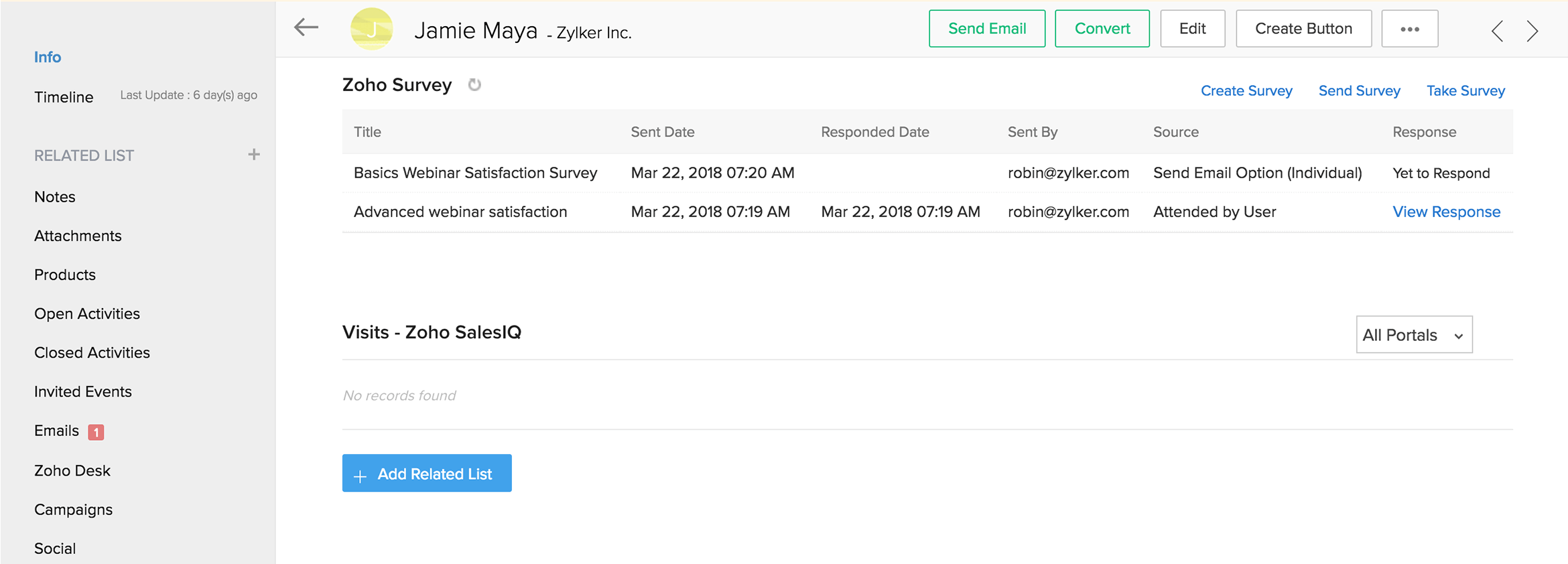 Sử dụng Zoho Campaigns để gửi khảo sát cho mọi danh sách email của bạn. Campaigns sẽ cho thấy cách đối tượng khảo sát tương tác với tin nhắn của bạn và Survey sẽ cho thấy họ đã trả lời câu hỏi của bạn như thế nào. Zoho CRM liên kết tất cả lại với nhau bằng cách cho nhóm của bạn một chế độ xem có tổ chức về tất cả dữ liệu này.