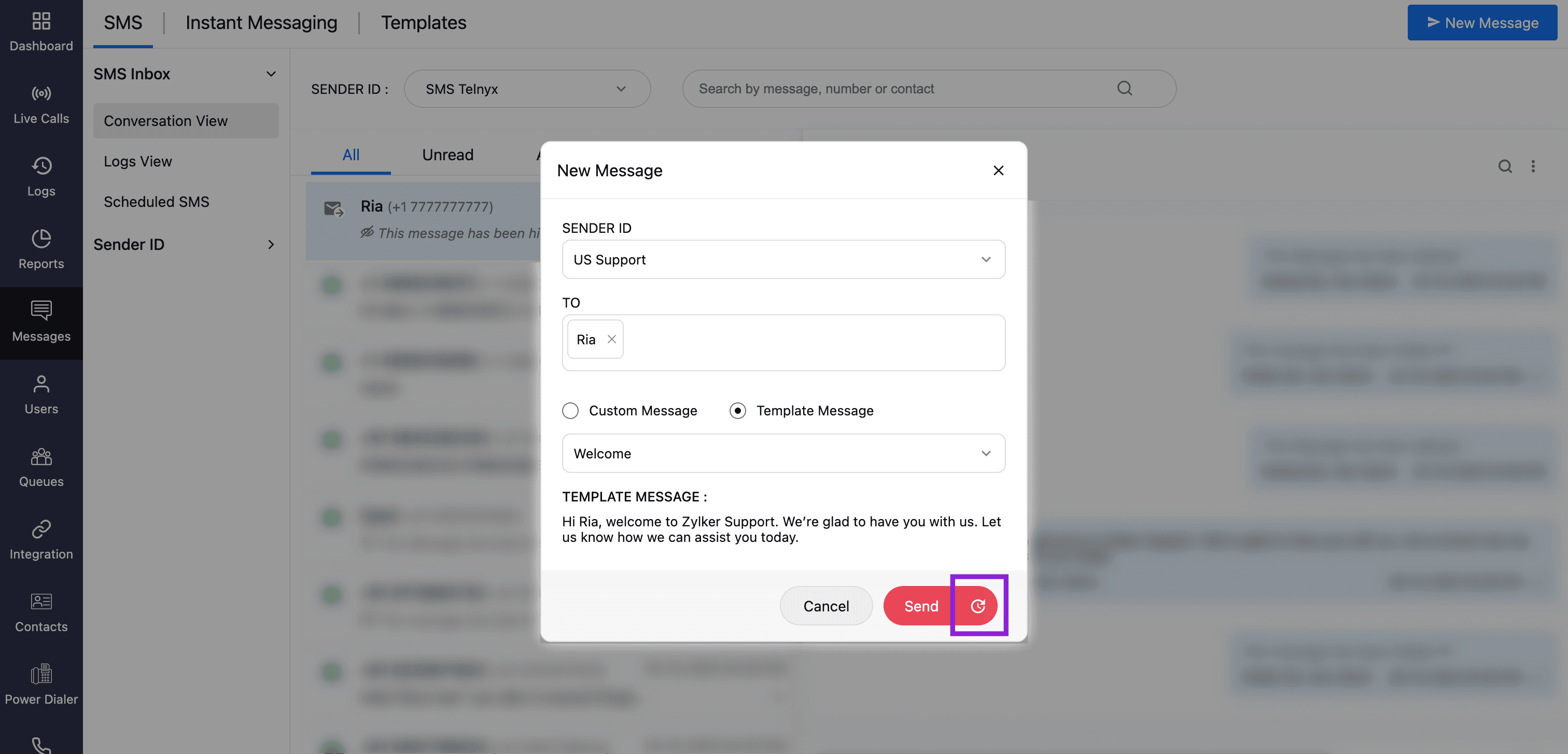 You can send SMS/MMS messages from the following locations in Zoho Voice:
