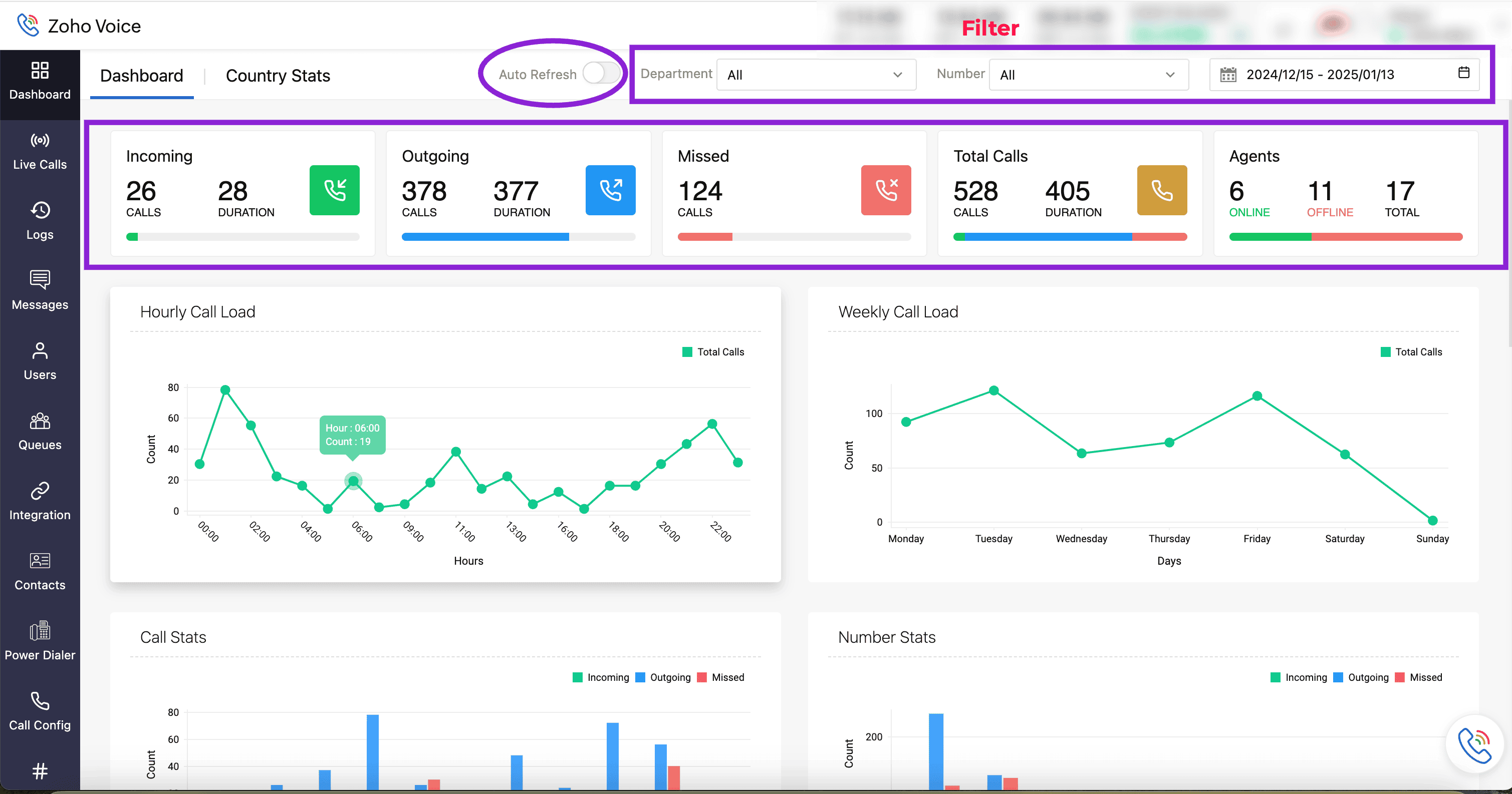 You’ll see key metrics like the numerical highlights of call activities - incoming, missed, and outgoing calls. The dashboard also includes helpful graphs that show hourly and weekly call patterns, giving you a better idea of peak times.