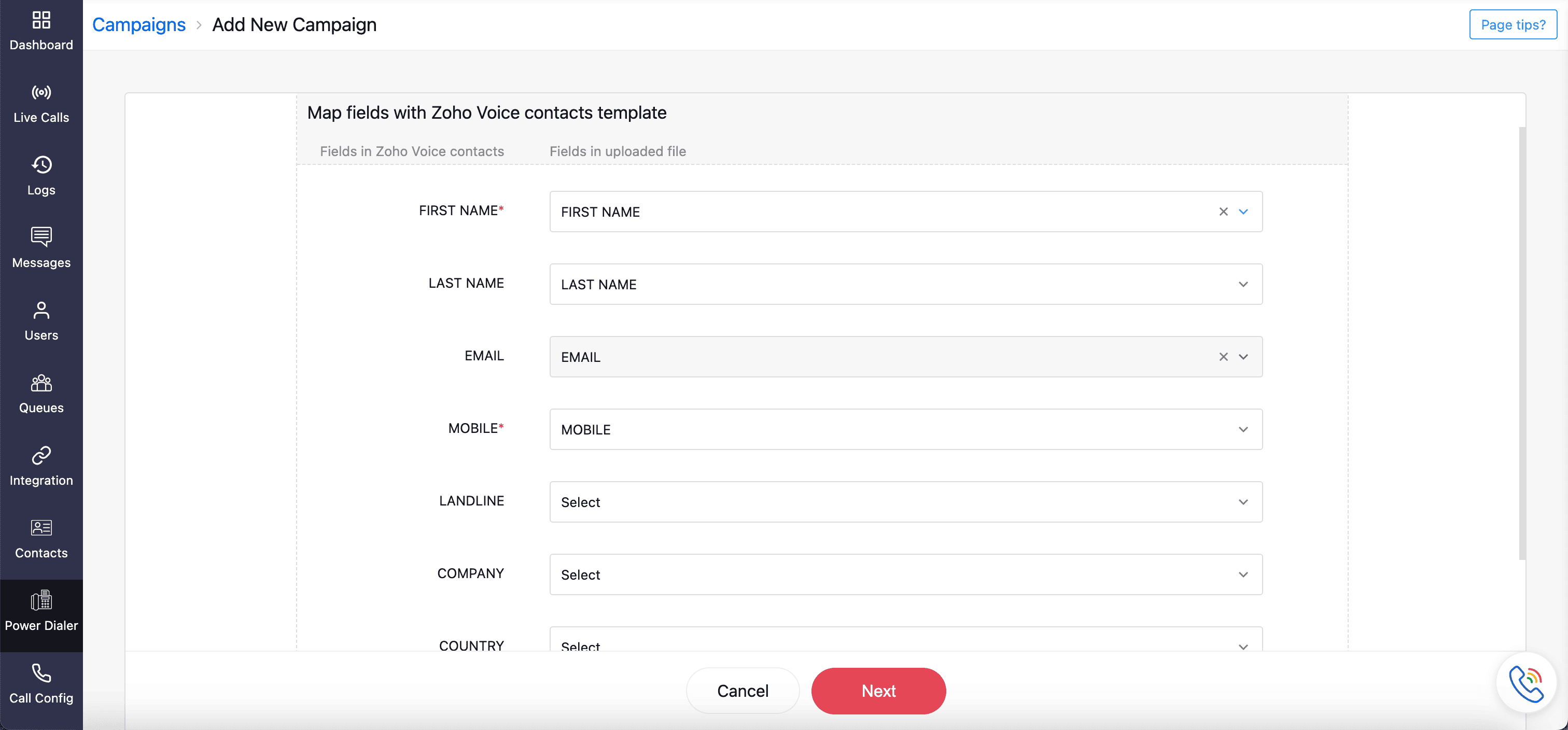 The First Name and Mobile fields are mandatory and must be mapped to Zoho Voice Contacts fields.