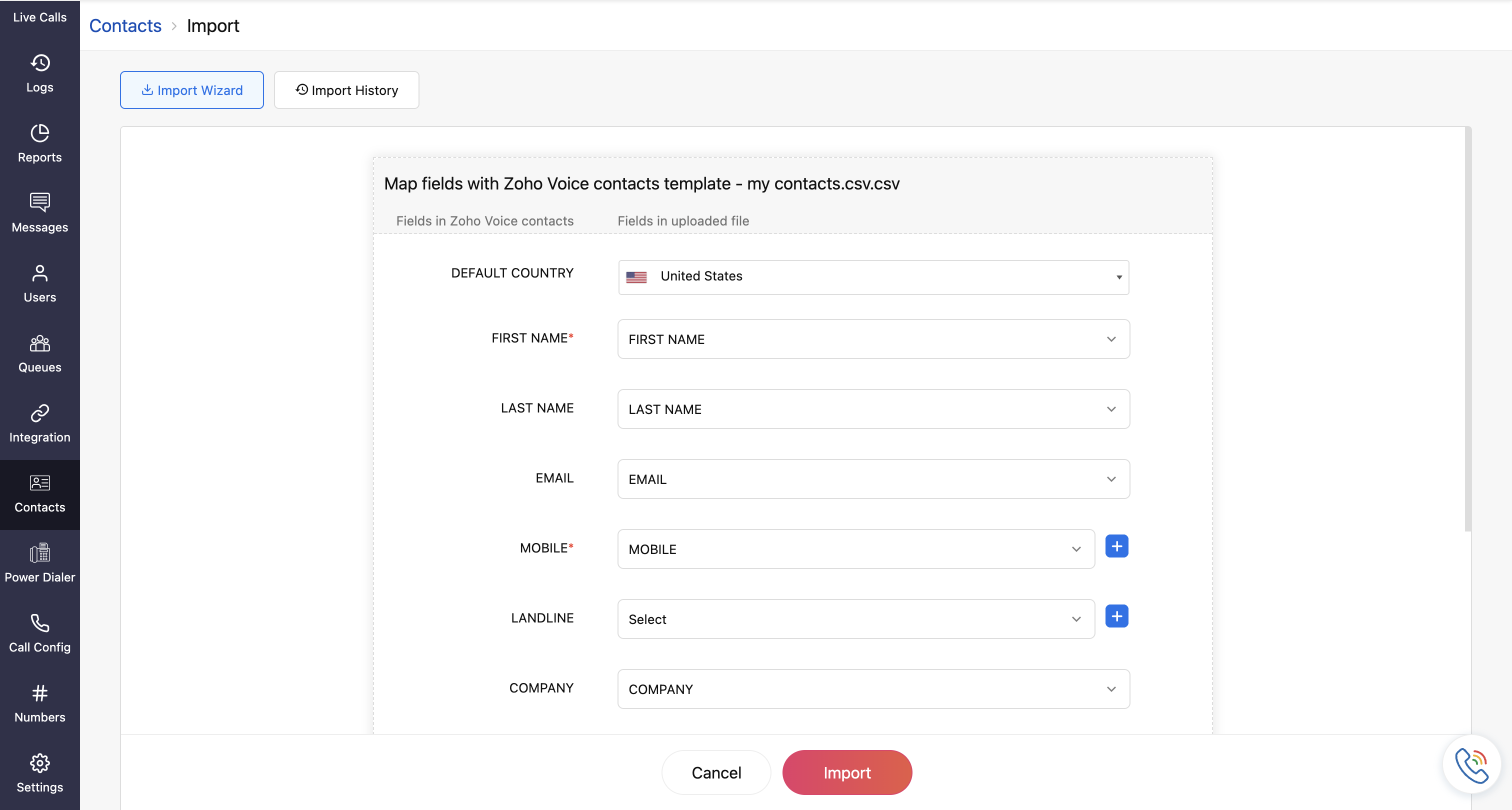 Zoho Voice automatically maps fields in your CSV file that exactly match the contact fields. For any unmatched fields, you’ll be prompted to map the CSV columns to the appropriate contact fields manually.