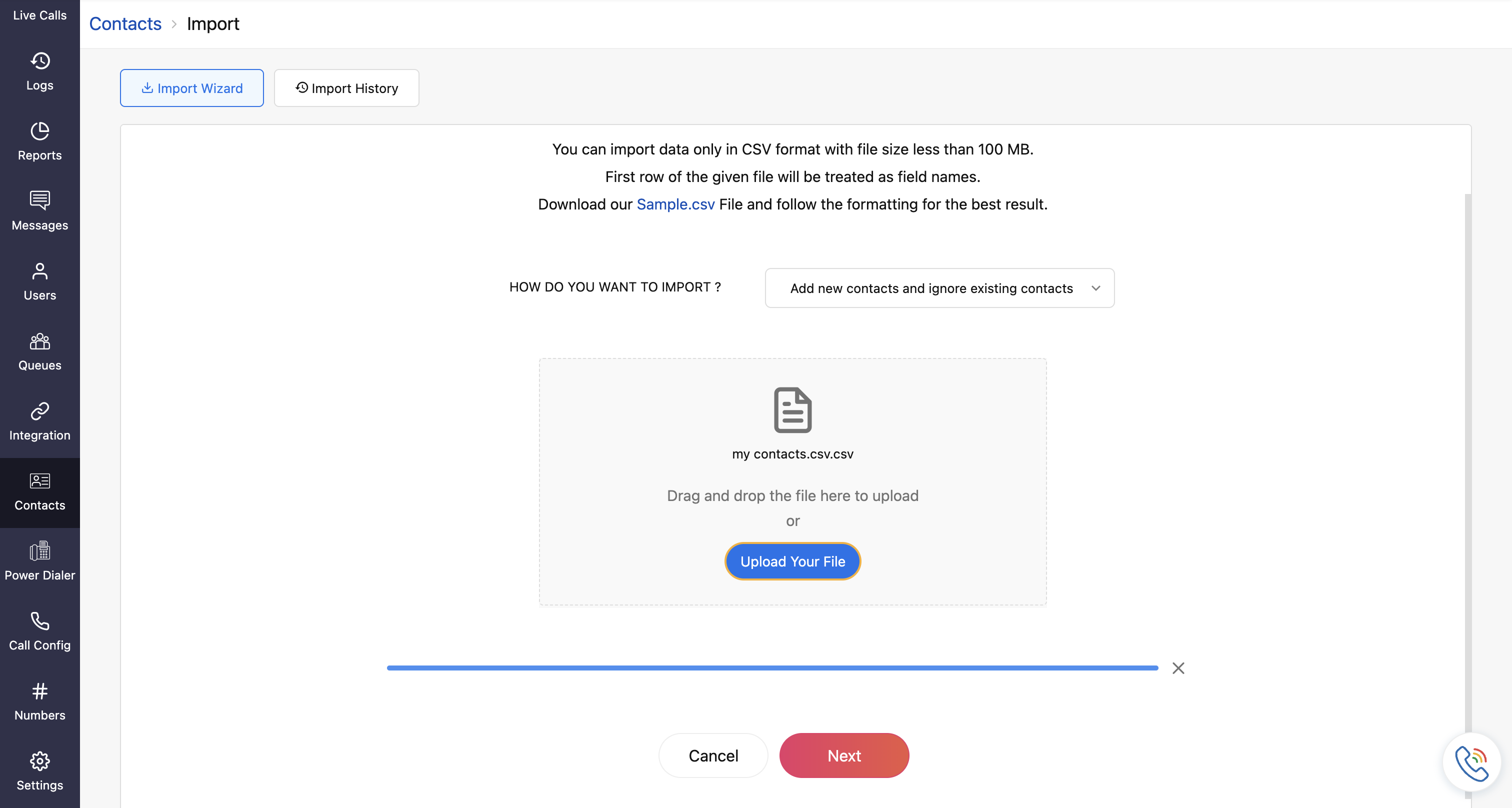 - Add new contacts and replace existing contacts: Imports new contacts from the file and completely replaces all existing contacts in Zoho Voice.