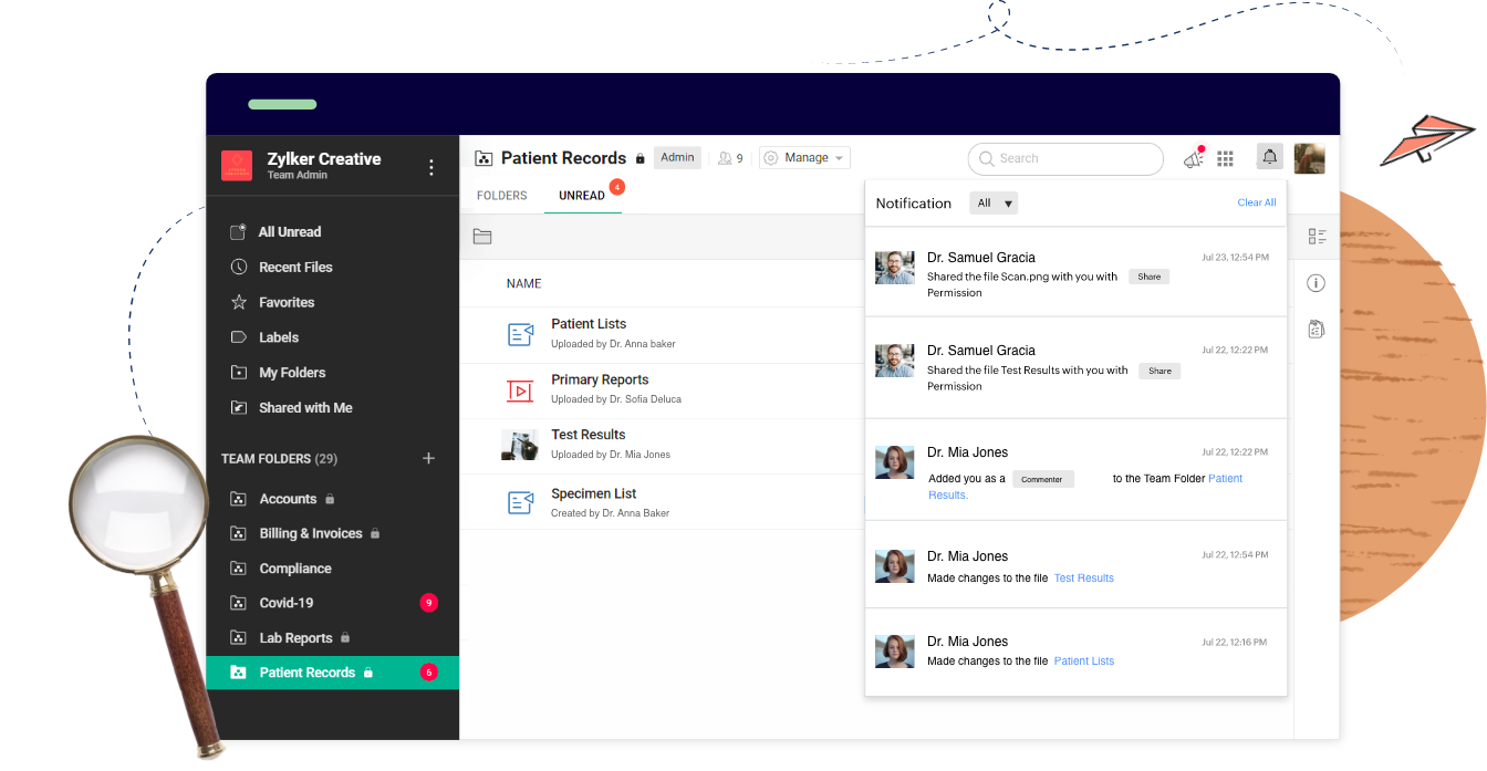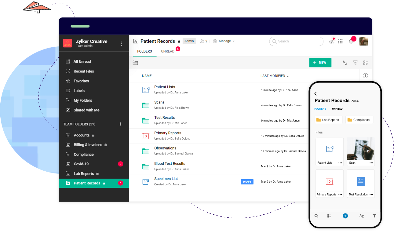 Keep your patient’s protected health information (PHI) safe with Zoho WorkDrive, a cloud storage and file sharing solution that helps healthcare providers securely manage medical records in a HIPAA-compliant manner.