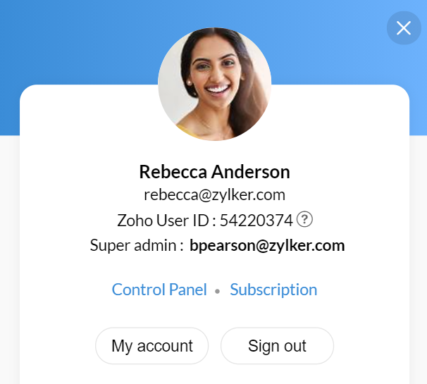 My account and Sign out options are also displayed here. Clicking My account will lead you to the Zoho Accounts page and Sign out option will log you out of your Zoho Account. In addition to this, the Admin account contains options like the Control Panel and Subscription that redirect to the Admin Console and Zoho Payments page respectively.