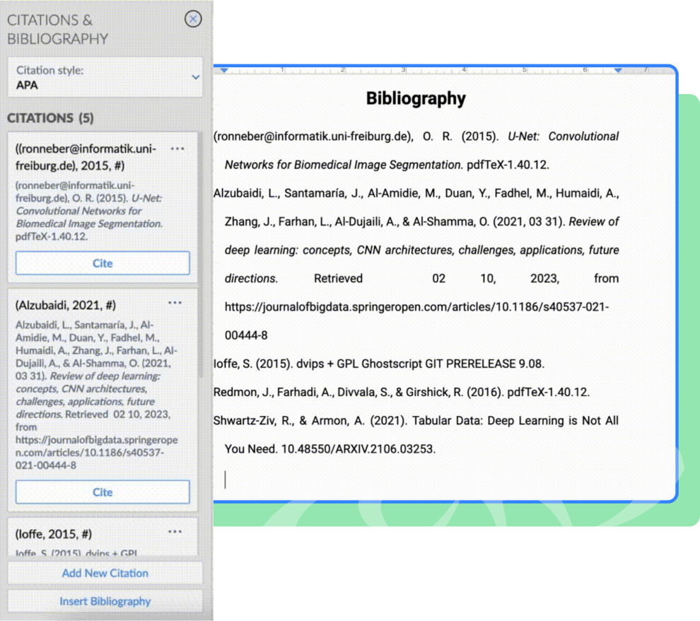Writing a research paper involves referencing various sources and adding them to the appropriate places. With Zoho Writer, you can insert citations in the style of your choice. Choose between APA, MLA, and Chicago Author-Date style.