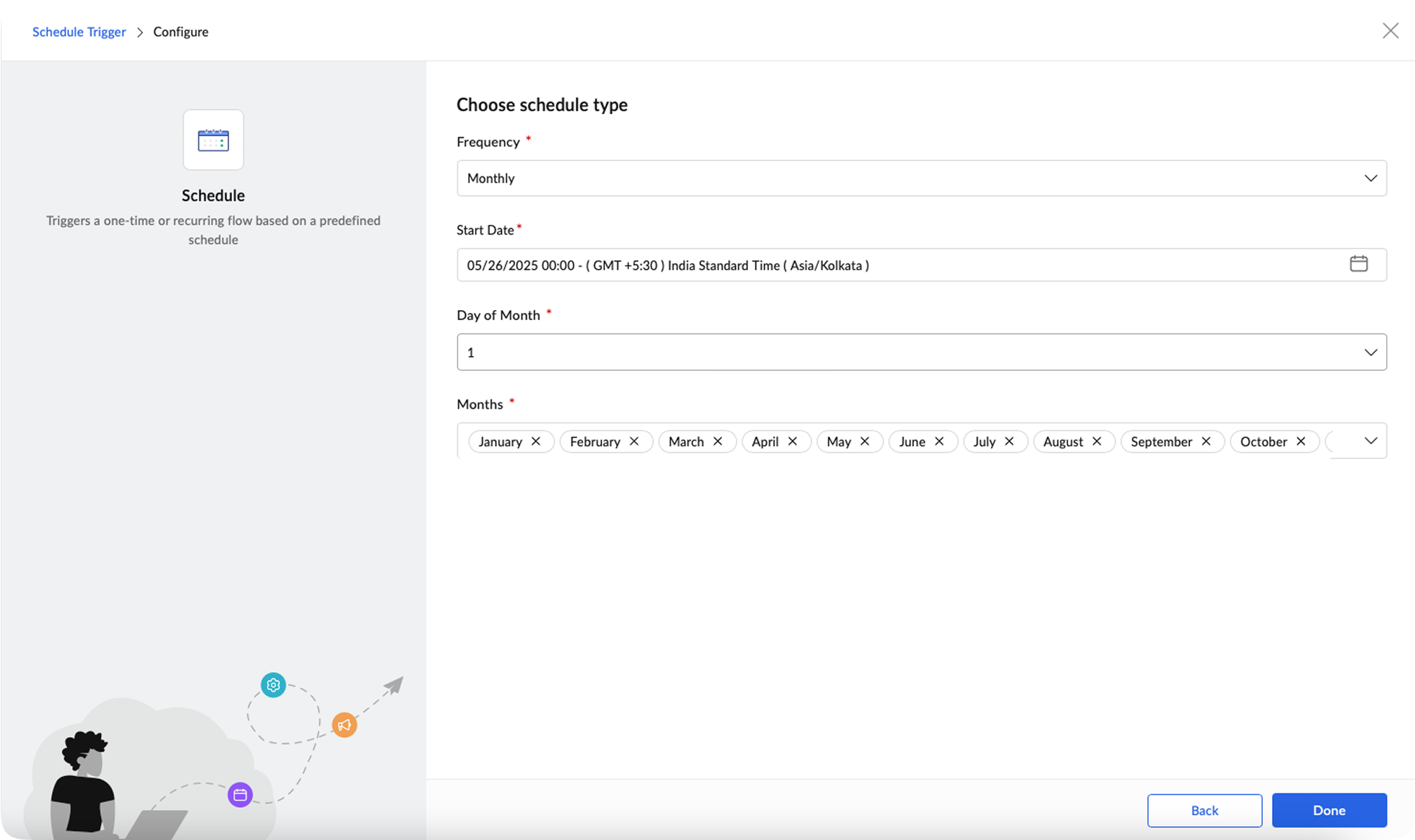 Along with custom events in your business apps, you can trigger workflows at specific times and intervals. Zoho Flow simplifies setting up schedules for daily, weekly, or monthly execution, as well as specific times on weekdays or weekends.