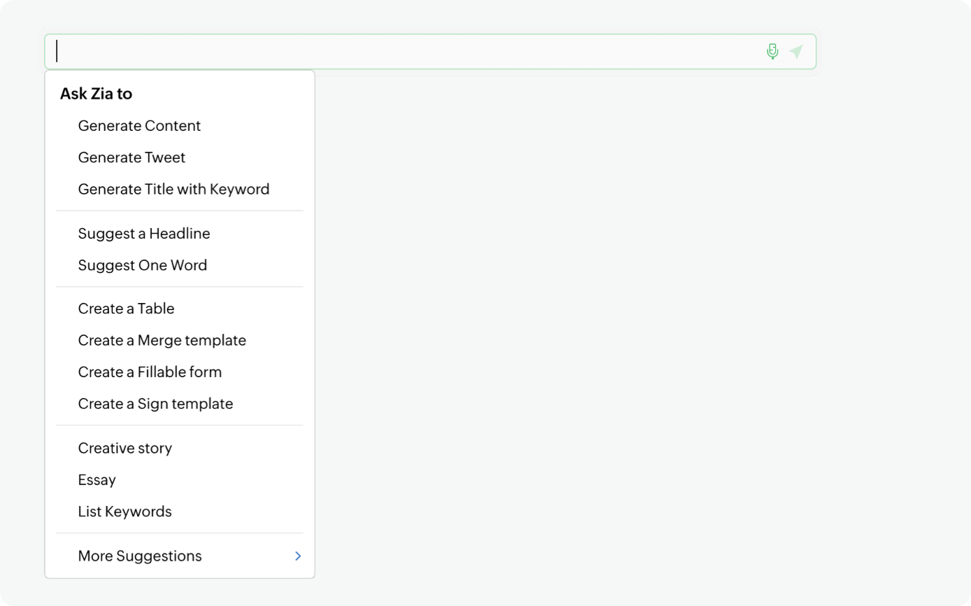 We've integrated Zia with ChatGPT for enhanced content creation capabilities. No matter what you're working on, Zia can help you create concise and compelling content. Learn more.
