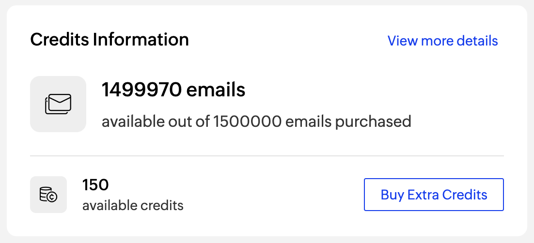The Credit Information section displays the subscription related information. ZeptoMail uses a credit-based system where a single credit allows you to send 10,000 emails. This help guide explains the subscription model in detail.